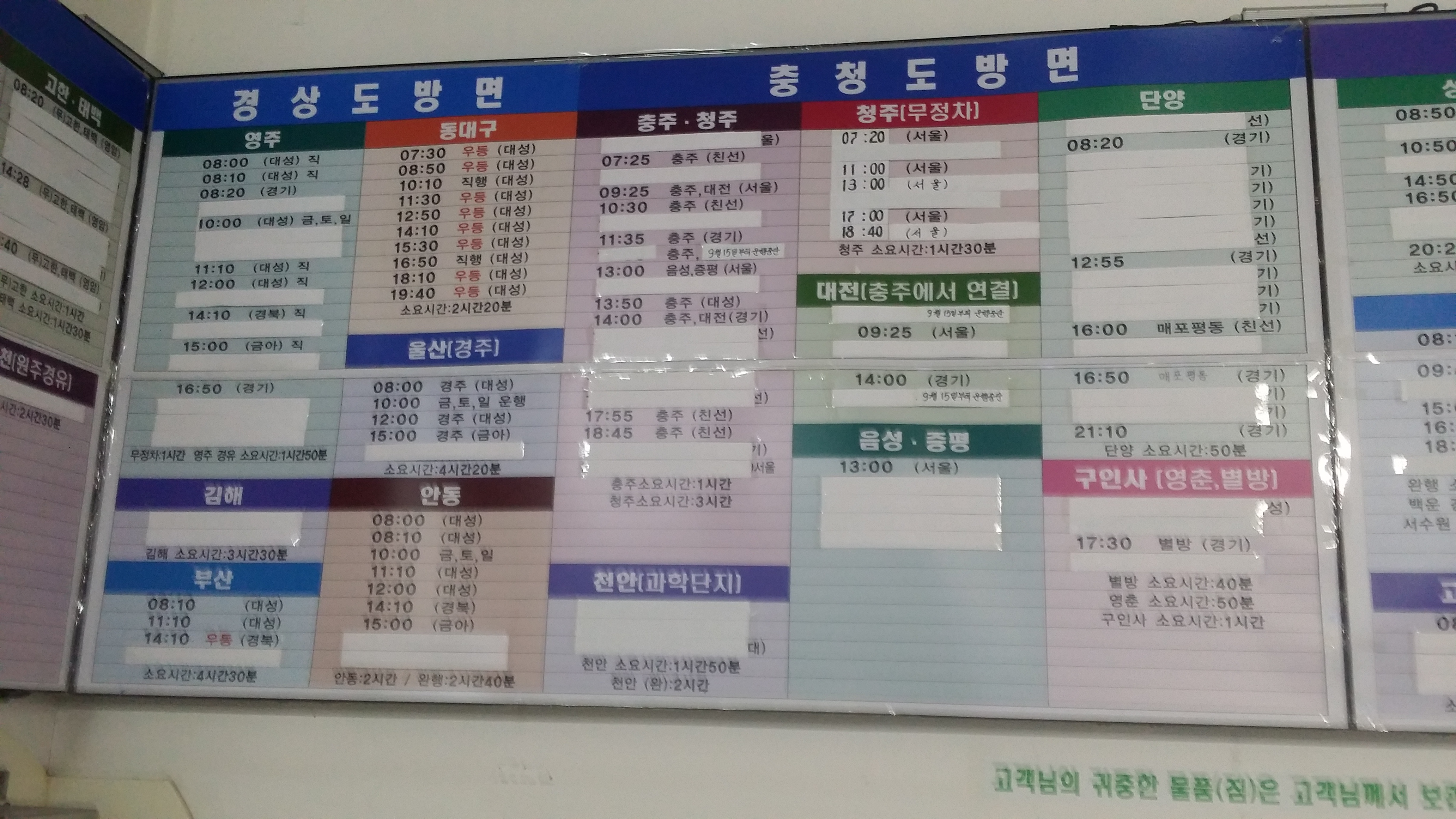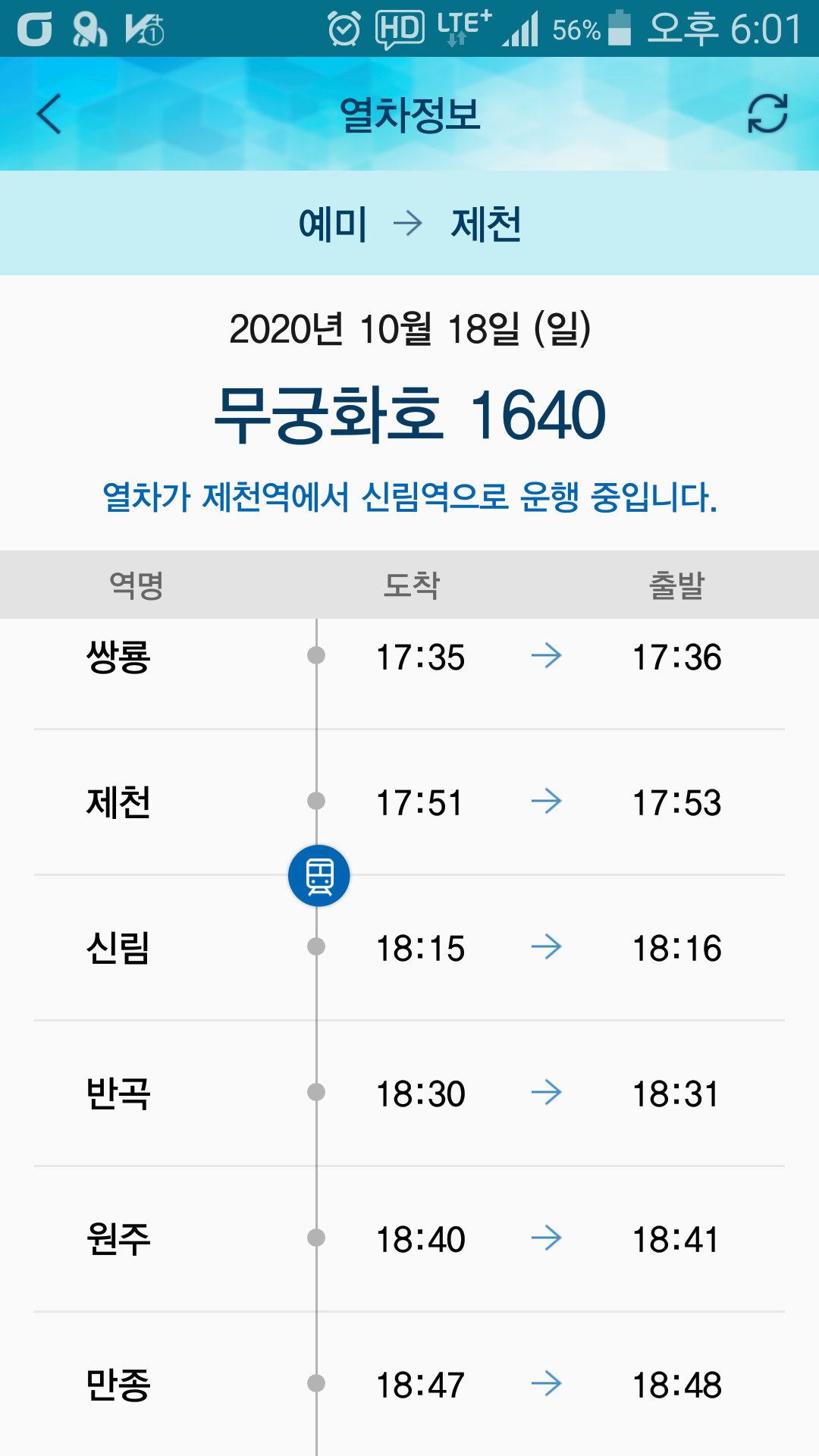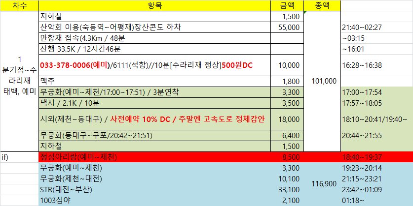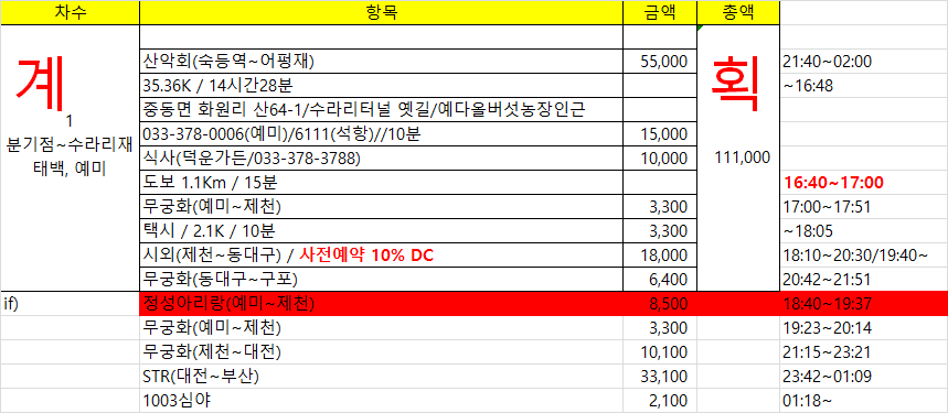 15:09 예미산(△/989.6m)15:25 968.5봉 / 이제부터 내리막인데 오를때 처럼 내리막도 급하게 내려선다16:01 수라리재예미역엔 조금 일찍 도착한 열차가 제천엔 3분 연착한다 덕분에 택시 승강장까지 열씸히 달렸다. 이럴 경우를 대비하여 승무원에게 제천역에서 택시 승강장 빨리 가기위해 하차 위치를 물어보니 무조건 앞쪽으로 내리란다(참고:기관차에 붙은 객차 앞쪽은 승강시설이 없다)주말이라 고속도로 정체로 버스는 동대구 복합센터에 18시41분 도착했다. 중도에 예약한 기차표는 반환처리했고 1시간을 기다려야 하는데 혹시나하고 플랫폼으로 달렸다. 18시44분 막 문을 닫을려는 찰라에 도착하여 기차에 올랐다. 표없이 탔다고 차장에게 훈계 듣고...제천시외버스 시간표