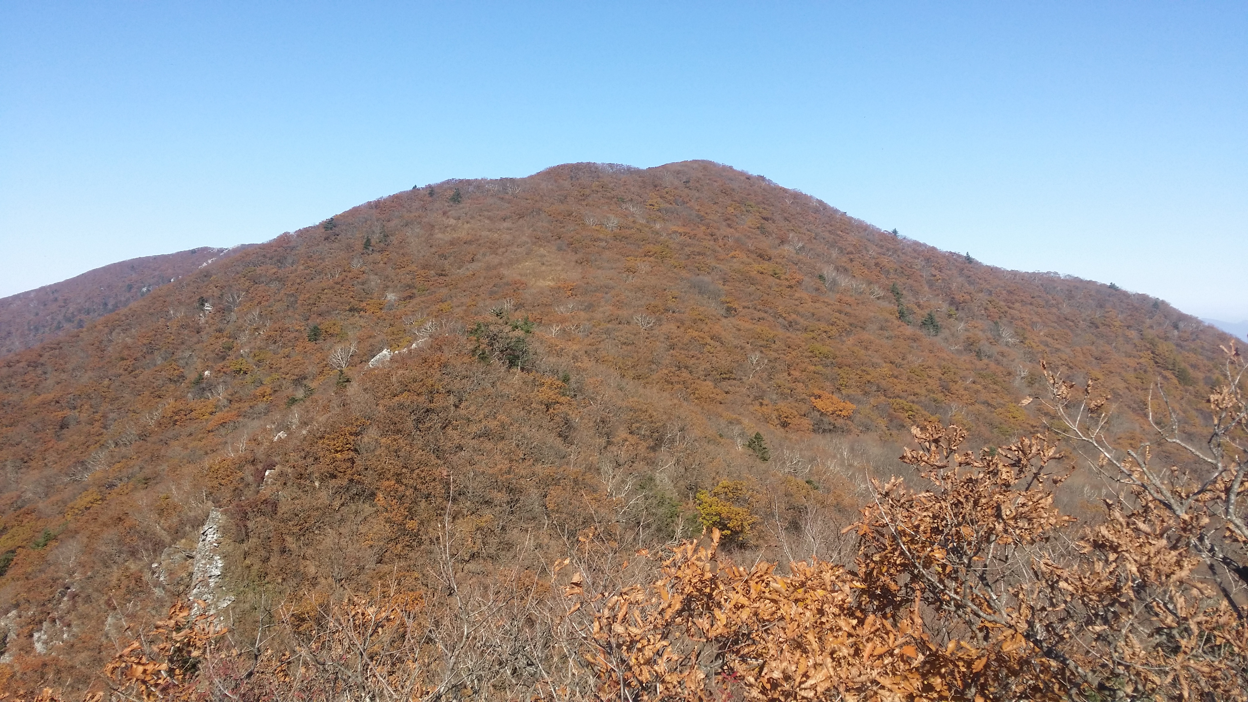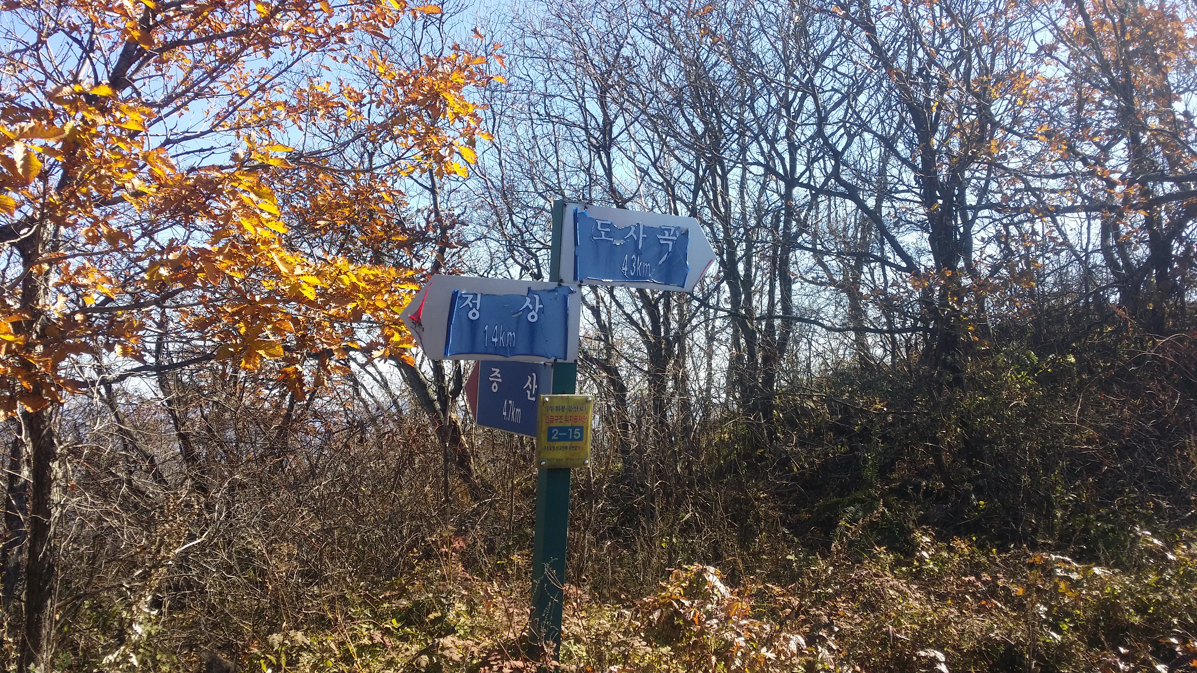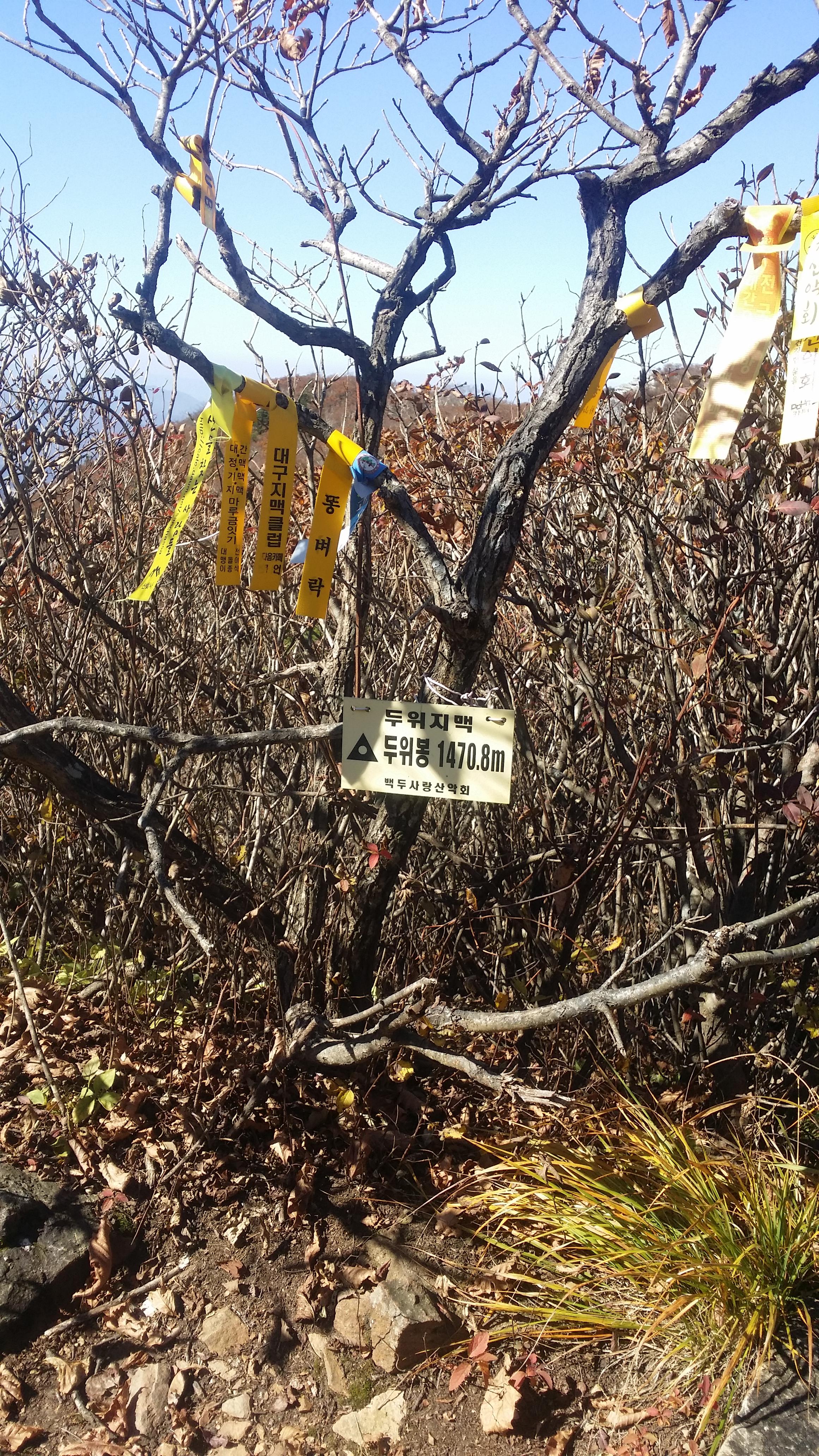 10:53 두위봉(斗圍峰/△/1470.8m/지리원 한글표기 : 두리봉)은 정선군 신동읍 방제리, 사북읍 사북리, 남면 무릉리와 영월군 중동면 직동리에 걸쳐 있는 산으로 태백산(1566.7m)에는 못 미치나 소백산(1439.7m)보다 높은 두위봉은 山이 되지 못하고 峰으로 남아있다. 일반적으로 여러 峰이 모여 하나의 山을 이루는데, 오히려 두위봉은 주위에 여러 山을 거느리고 있다. 산 모양새가 두툼하고 두루뭉실하여 사람들이 두리봉으로 불렀다는데 이를 한자로 옮기면서 두위봉이 된 모양이다.(조은산님 블로그에서 발췌)11:04 자뭇골 갈림길11:10 죽렴지맥 분기점11:42 1118.9봉1118.9봉 지나 임도를 만날때까지 마루금은 진입 불가하다. 좌측으로 우회하다 중간에 혹시나하여 들어갔는데 도저히 진행 불가하다 만약 고집을 부렸다면 오도가도 못하는 상황이 발생할뻔 했다12:05 임도