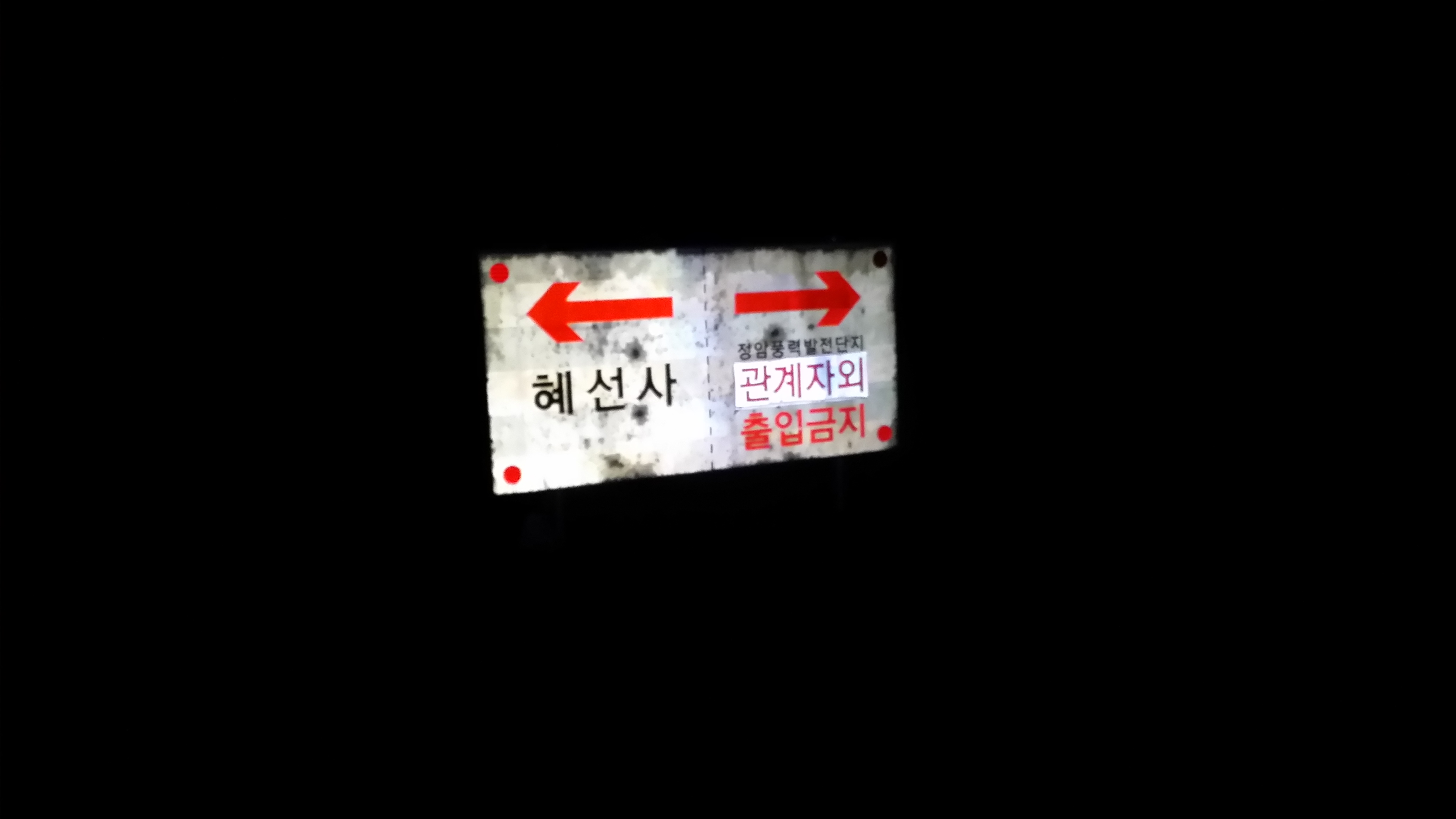 03:22 만항재 / 매점 뒷쪽에 산패가 있다는데 놓쳤다 / 하이원 CC 까지는 길찾기가 힘드네 03:48 혜선사 갈림길 / 풍력발전단지로 들어서는데 어둠속에 헤드랜턴을 돌려 달라는 소리가 들린다. 뭐하는 친구인지 모르겠지만 길이 없다며 혜선사 방향 임도를 권장한다. 알아서 간다며 숲을 들어서는데 멧돼지인지, 고라니인지 소리가 들린다. 아까 그친구 포수. 그럼 멧돼지 사냥, 오싹하다. 멧돼지도 겁나고 오발탄도 겁난다