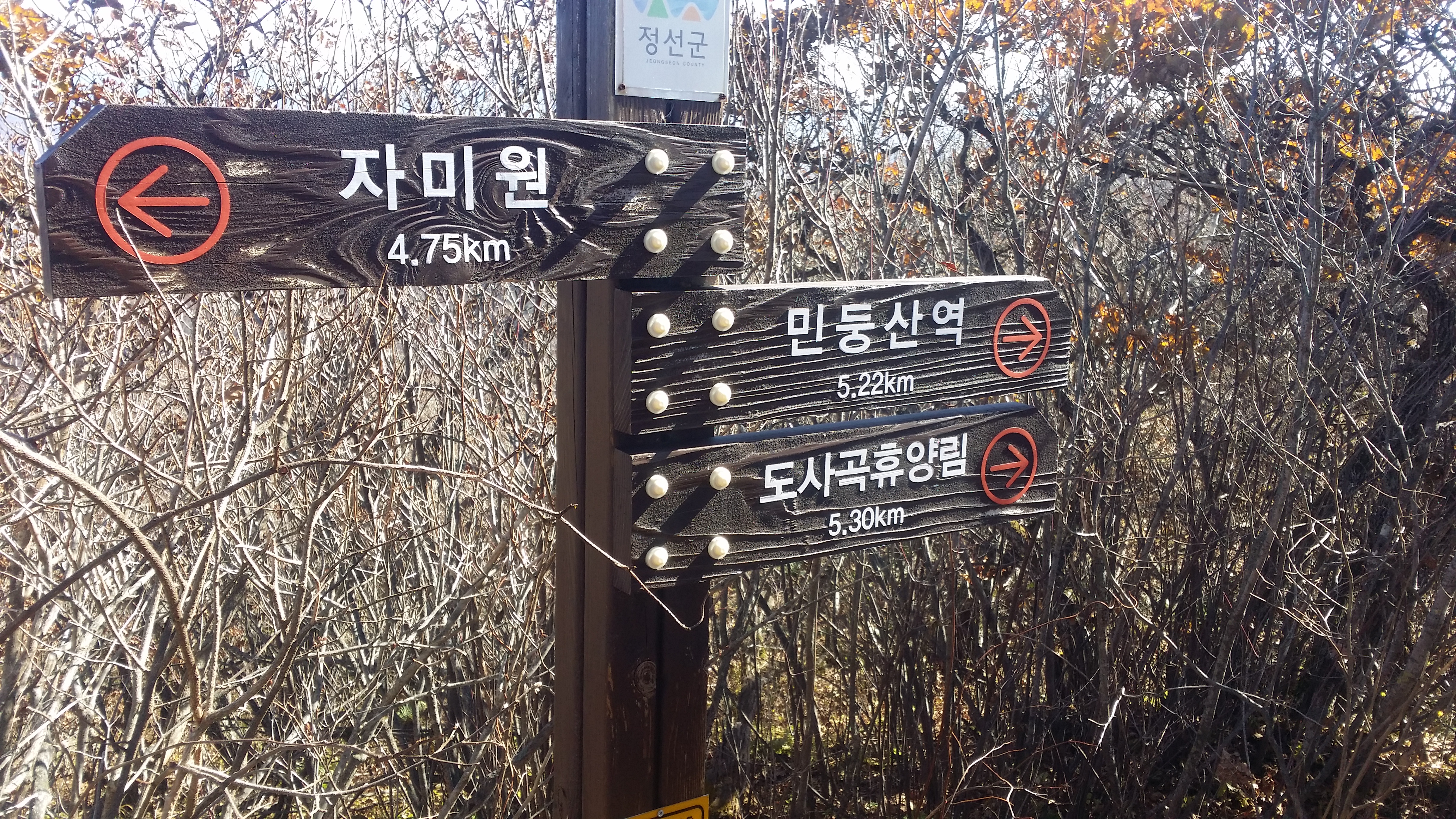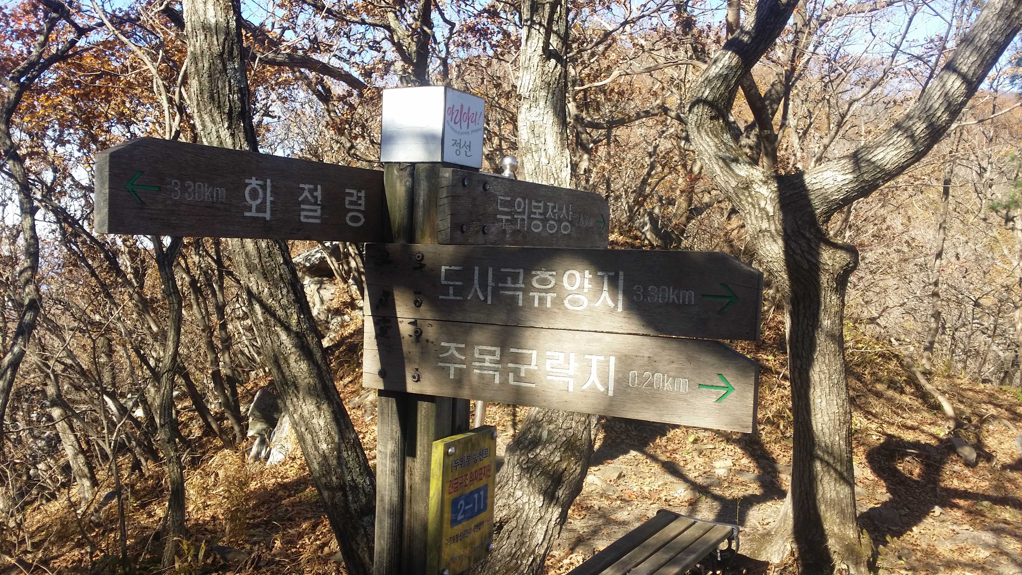 09:22 1441.5봉(△)09:52 너덜지대 시작과 끝지점에 이정표가 있다10:00 도사곡휴양지 갈림길 / 10분만 투자하면 천연기념물 제433호 정선 두위봉 주목을 볼수 있는데, 예미역에서 17시 기차를 타야 집에 일찍 귀가 가능한데, 포털사이트를 통해 예미역 부근 택시 영업장 전번을 확보 했지만 영월시내에서 영업하면 호출시 계획된 시간보다 더 소요될 우려. 최악의 경우 8.5Km를 걸어야하는 불상사. 산행후 택시 호출 실패한 케이스가 많아 안심 할수 없는 상황이다. 10:10 1379.8봉에서 / 1441.5봉을 기준으로 시계방향으로 한바퀴10:33 1458.9봉10:33 증산 갈림길10:39 민둥산역 갈림길