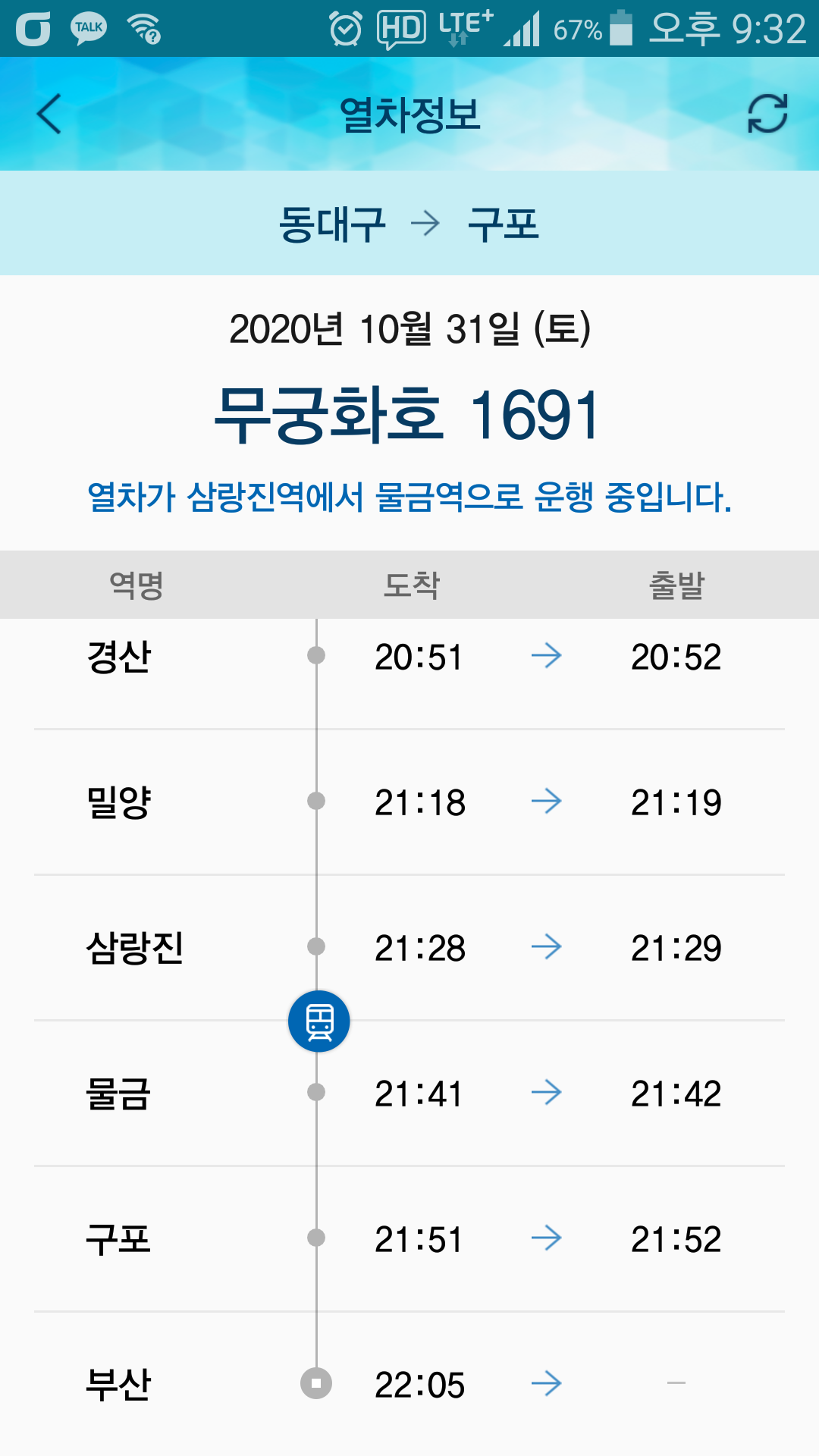 오늘은 여유있게 20시42분발 무궁화 열차에 오른다. 참고로 20시38분발 KTX를 먼저 보내고 안전거리 유지후 무궁화 열차가 출발하는 관계로 20시45분경 출발한다