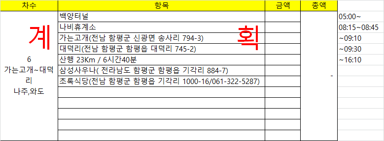 10:50 함평IC 지하통로 / 대진마을 통과지점 잡목으로 애먹다 11:22 삼거리상회11:30 폐쇄된 주유소 뒤로 마루금인데 대다수가 생략하고 23번 국도를 따라 진행했던데, 진행하는데 무리가 없는 등로다11:38 114.1봉 / 삼각점을 너무 남발한다11:43 공장 귀퉁이 정면에 23번 국도를 통과하는 지하통로가 보인다11:45 지하통로맥길은 지하통로를 통과하여 버스정류소 왼쪽으로 등로가 있습니다. 길이 좋지 않습니다 12시경 축사 경계 펜스를 따라 진행하면 좋는데 나무로 막아 놓아 가시길을 이리저리 피하며 진행 합니다. 능선에 올라서 내려서면서 우측으로 붙어야 하는데 등로가 안좋아 좌측으로 올라서니 알바인줄 모르고 펜스를 따라 진행할만 합니다. 12:21 벽유육교 / 마루금은 23번 국도를 횡단하는데 우회한다 / ~149봉 오름길 장난이 아닙니다12:48 149봉 / 내려서며 A조와 조우한다. 평소보다 늦다. 가야할길도 상당히 힘든가 보다. 13:00~13:10 전망대에서 밥먹고 간다