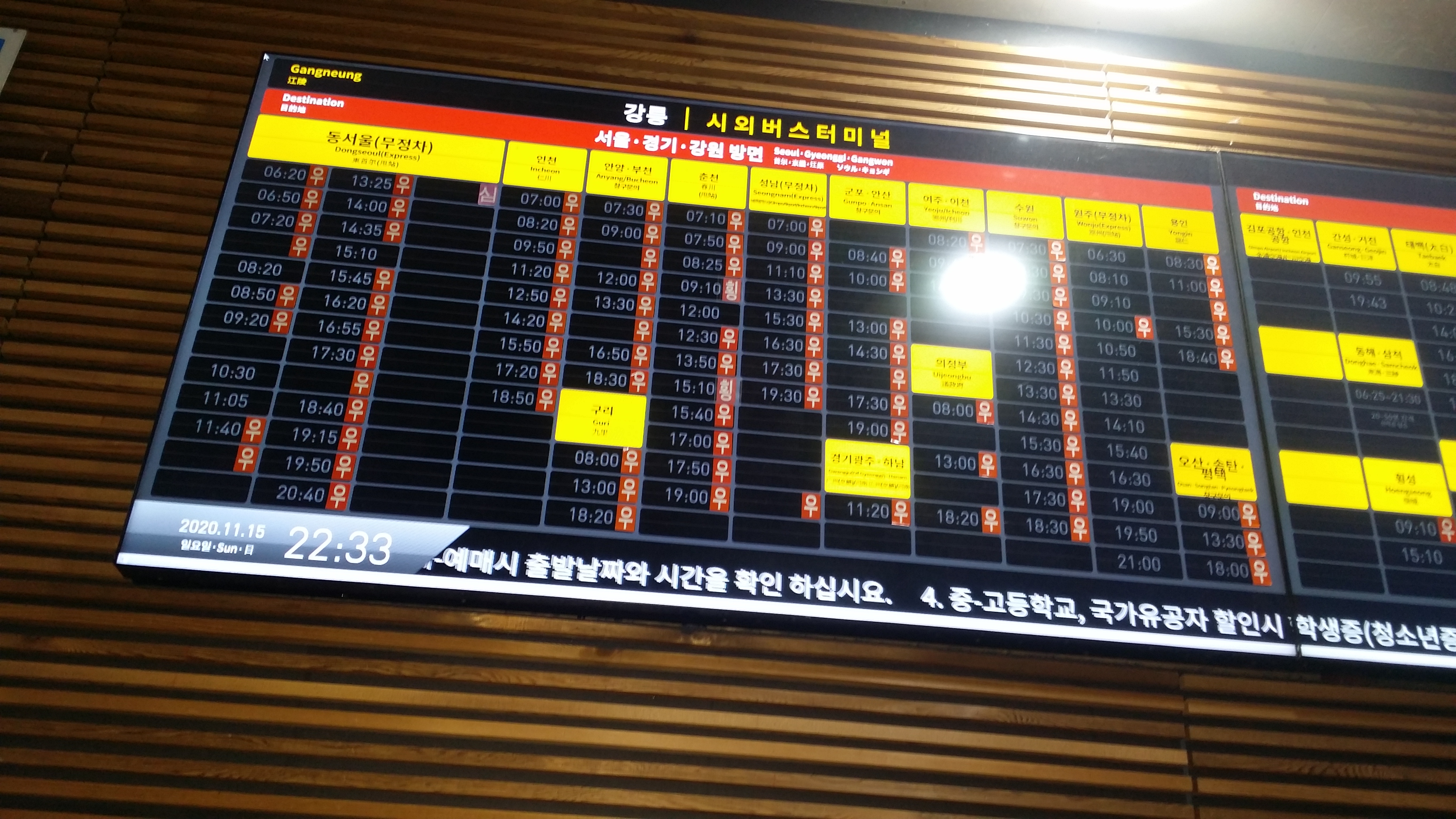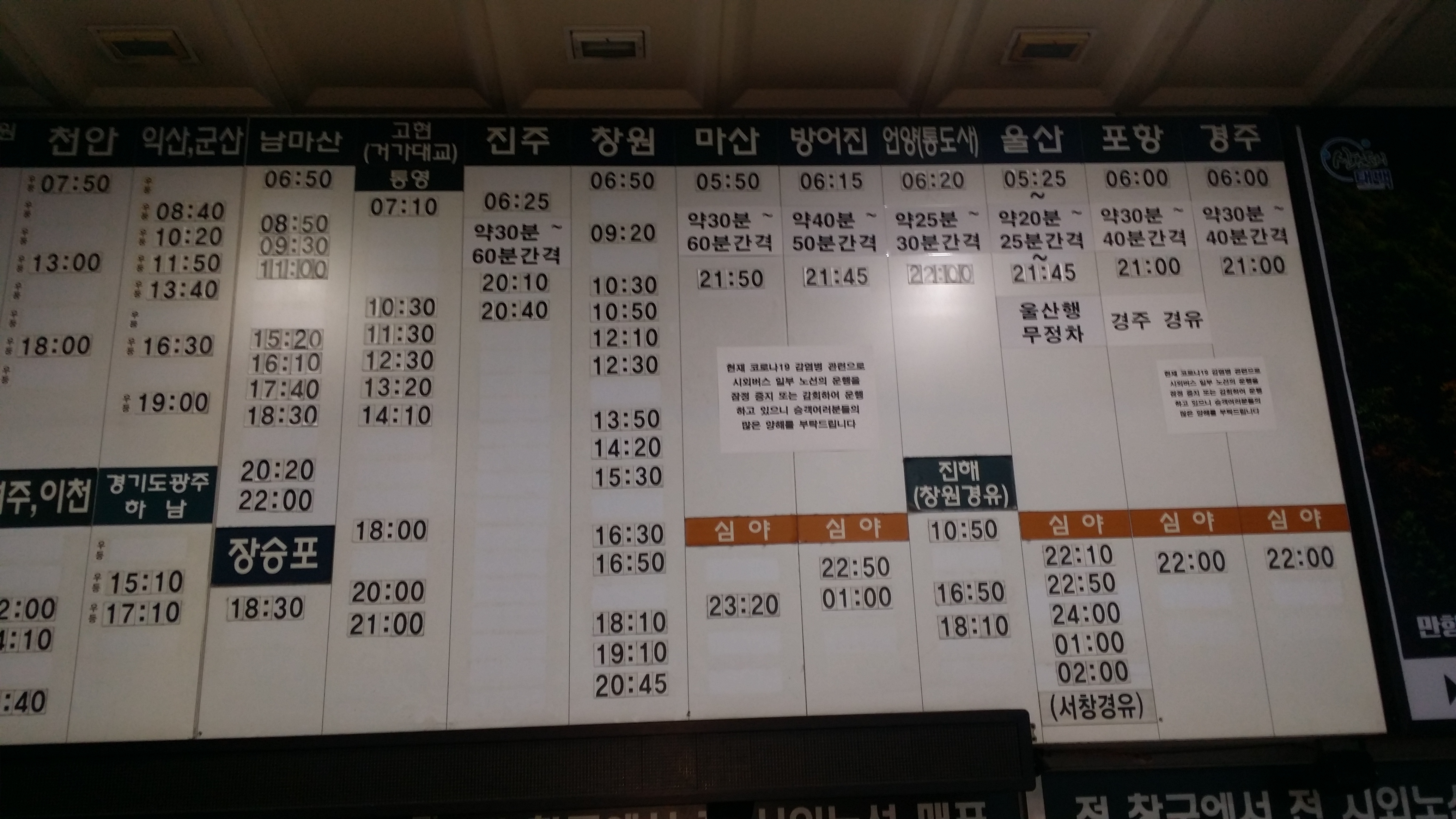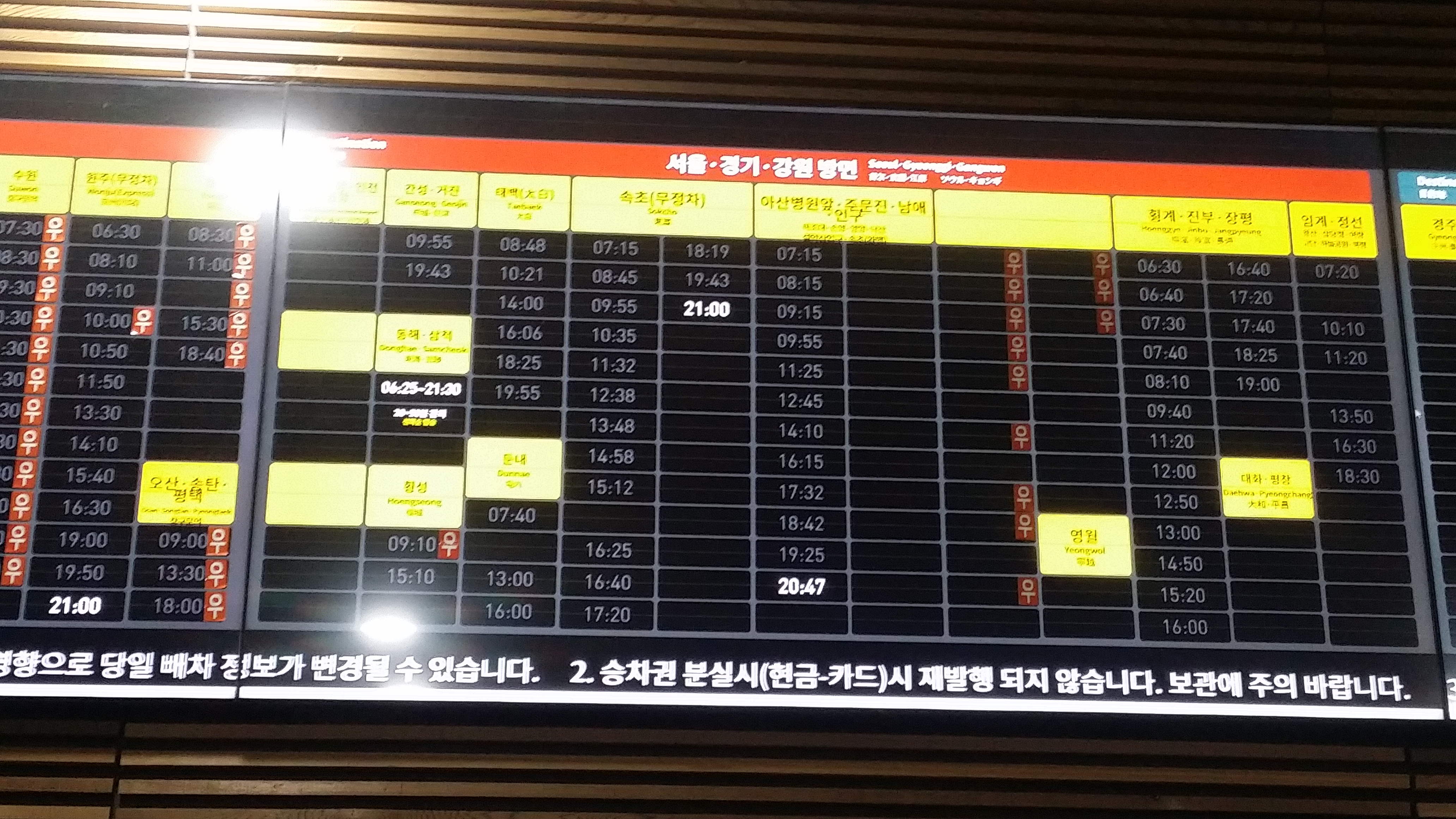 17:52 아우라지 입구를 내려서기전 415지방도로가 보여 그냥 내려설까 했는데 유종의 미를 거두자고 마루금으로 진행합니다. 뚜렷한 등로는 없습니다 대충 내려 설려는데 참고한 트랙이 좌측으로 진행하여 혹 등로가 있나 싶어 이동 했더니 주택으로 내려 섭니다. 다행히 불이 거져 있어 우측으로 이동할려 하니 쓰렂ㄴ 나무가 가로막고 있어 다시 올라섭니다. 내려올때 어둡다보니 경사가 가팔라 아무 나무나 잡았는데 가시나무가 제법 있어 찔리고 끓히고, 끝이 끝난게 아니네요겨우 415번 지방도로 내려서 아우라지로 향합니다17:59~18:02 휴대폰 밧데리도 내맘을 몰라 주네요 방전이 되어 후레쉬가 안터져 교체하고 암무완수18:04 징검다리를 건너18:07 다리를 건넙니다18:16 아우라지역 / 주말에 딱 1번만 운행되는 종착역18:18 온맵상 여량(아우라지)버스 터미널이 애매 합니다. 사거리를 지나는데 편의점 사장님이 분리수거하러 나오십니다. 나전터미널에서 강릉가는 시외버스가 있던데 혹시 이곳을 경유하느냐 물으니 중국집앞에서 기다리면 된다네요. 사장님 넘 친절하게 제가 정위치에 설때까지 입구에서 코치해 주십니다 당시는 어두워 관심을 아가졌는데 여랑터미널과 택시 사무실등 부지가 넓네요.시간을 잘못 알고 맥주한캔 마시고 저녁은 강릉에서 먹을려 했는데 19시경 도착 예정이라 라면도. 강릉까진 1시간 걸린다며 어데서 왔냐 "부산" 부산어디 "해운대" 혼산하냐 "예" 동무랑 같이 다니면 좋을텐데 혼산하는걸 보니 산을 무척 좋아 하는갑죠 미소만 지었다 나도 나에게 묻고싶다 맞냐?19:07 정선에서 출발한 버스가 온다대략적인 버스 운행 시간이다19:30~19:35 임계터미널20:16 강릉에 도착하여 예매한 승차권을 발급한다강릉시외버스 시간표 / 빛 반사로 같은 장면을 몇번 찍었다힘들게 운동하고 나쁜건 죄다 먹는다동해공영 시외버스터미널01:20 칠보산휴계소 / 강릉쪽 심야버스를 4번 정도 이용해봤지만 구조적으로 잠을 이룰수가 없다. 몸은 몹시 피곤한데 힘들게 눈을 붙였다하면 깨운다. 동해에서 1시간30분 운행하고 깨운다포항시외버스 시간표부산종합터미널 시외버스 시간표04시에 도착했다. 지하철이 운행 할려면 1시간10분을 기다여야한다. 배도 출출하고 해서 또 라면