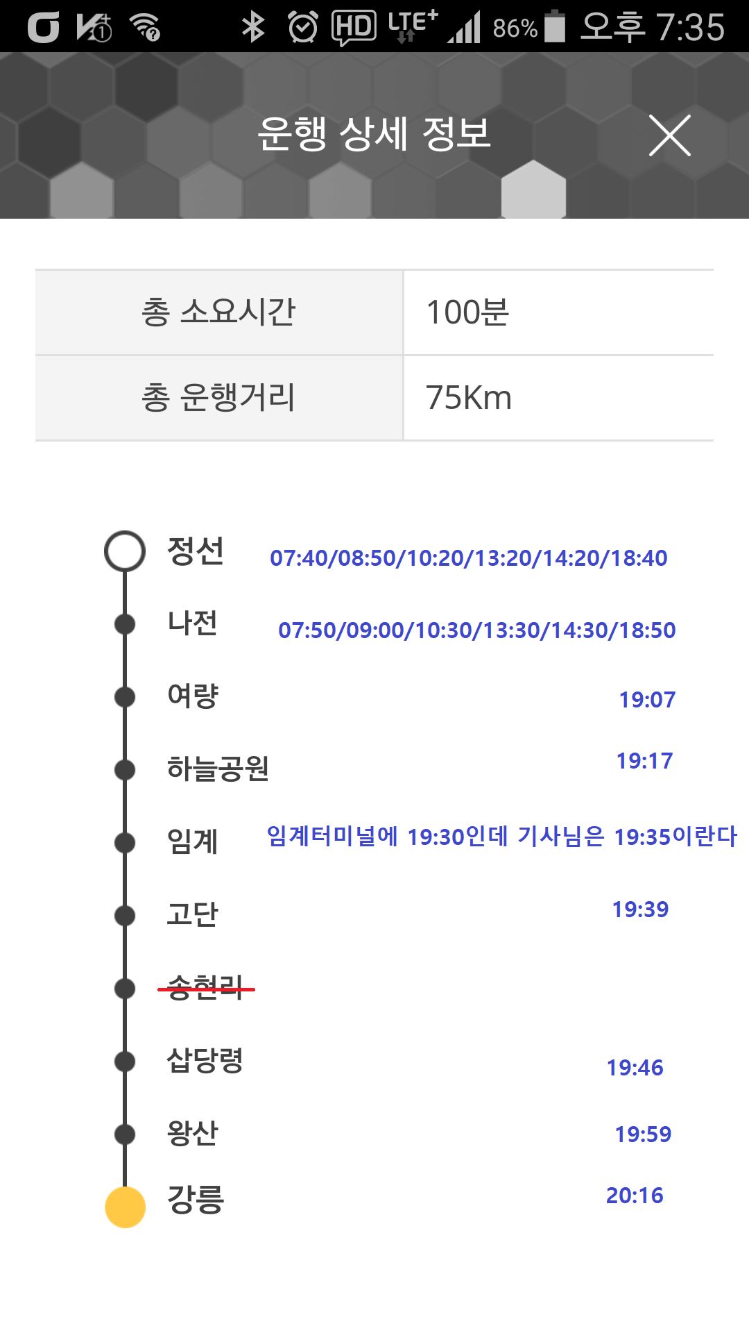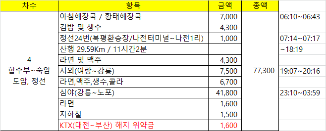 우려했던일들이 현실로? 자연휴양림이 산방 저촉된다고 생각도 못하고 왔다. 읍소해봤지만 퇴짜맞고, 힘들게 왔는데 그냥 되돌아 갈수 없어 무작정 능선을 올라서다 보니 정규 탐방로보다 1시간을 더 소비하는 관계로 애초 또 하나의 지류인 오대천&골지천 합수부 마루금을 반타작 못한게 화근이 될것 같았는데, 적중했다. 지난번 1박2일 산행때도 첫날은 잘나갔는데 이틀째 체력이 급락하여 택시를 호출하여 탈출했는데, 1시간50분 여유 있는데, 설마하는 생각에 KTX(대전~부산) 예매했다 위약금을 물었다. 다행히 시외버스 시간표를 블로그 하는게 습관이 되어 나전시외버스정류장에서 강릉행 버스 시간표를 본게 귀가하는데 도움이 되었다