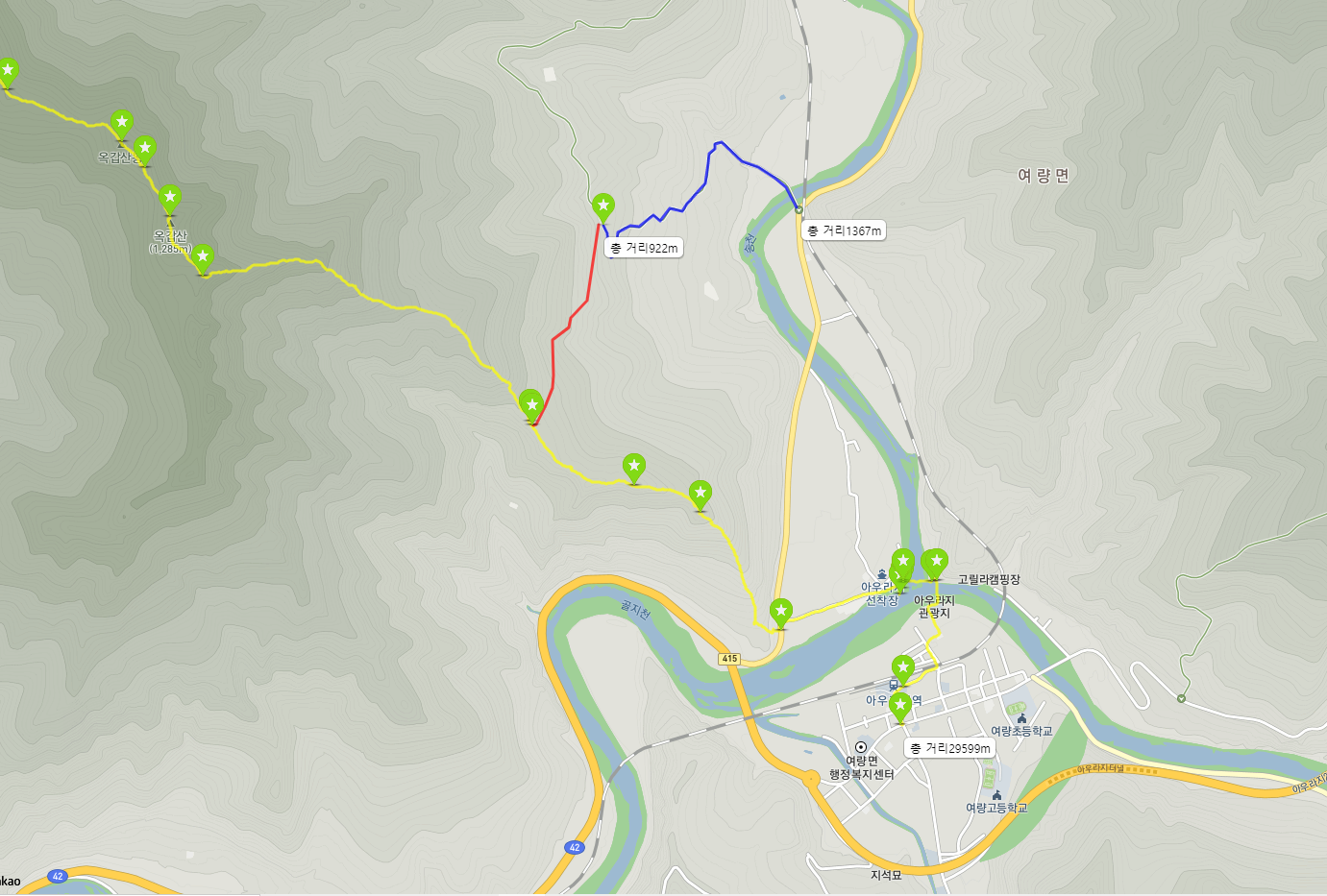 17:12 진행방향우측으로 하옥갑사 가는 임도고 하산한(옥갑산봉) 방향으론 상옥갑사 가는 비포장 도로 입니다. 상옥갑사에서 내려오는 SUV 차량을 만났습니다. 17시22분 정선 아리랑 열차를 꼭 이용해야 한다면 콜을 때리고 우측으로 1Km 비포장길을 걸어가면 될것 같습니다 상옥갑사 갈림길까지 나가면 여기서 부터는 포장 도로로 택시 이용이 가능 할것 같습니다.노란란선이 맥길이고, 빨간선(1Km)이 비포장도로, 파란선이 포장도로 입니다여랑에서 강릉행 시외버스(개인택시 사무실앞)를 기다리는데 택시가 들어와 한장 찍었습니다 영업시간은 07:30~20:00 입니다17:22 673.3봉