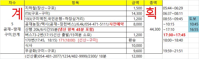 처음 계획을 잡을땐 최종 날머리 낙동정류소에 시외버스가 다녔는데 요즘은 폐지된것 같아 날머리 탈출을 고민 했는데 선산~낙동간 시내버스가 있다. 17시45분 버스를 내심 기대했는데 놓치고 18시 버스에 오른다. 기사님께 소요시간을 여쭈니 약 40분 걸린단다 19시59분 차를 예매했는데코레일톡 모바일앱 이용시 1회에 한하여 열차 변경이 가능하네요. 18시45분차가 있어 18시37분 구미역 전(국민은행)에 하차하여 신호빨 받고 플랫폼까지 달렸더니 3분만에 도착했습니다. 그리고 18시45분 열차로 변경해 귀가 합니다