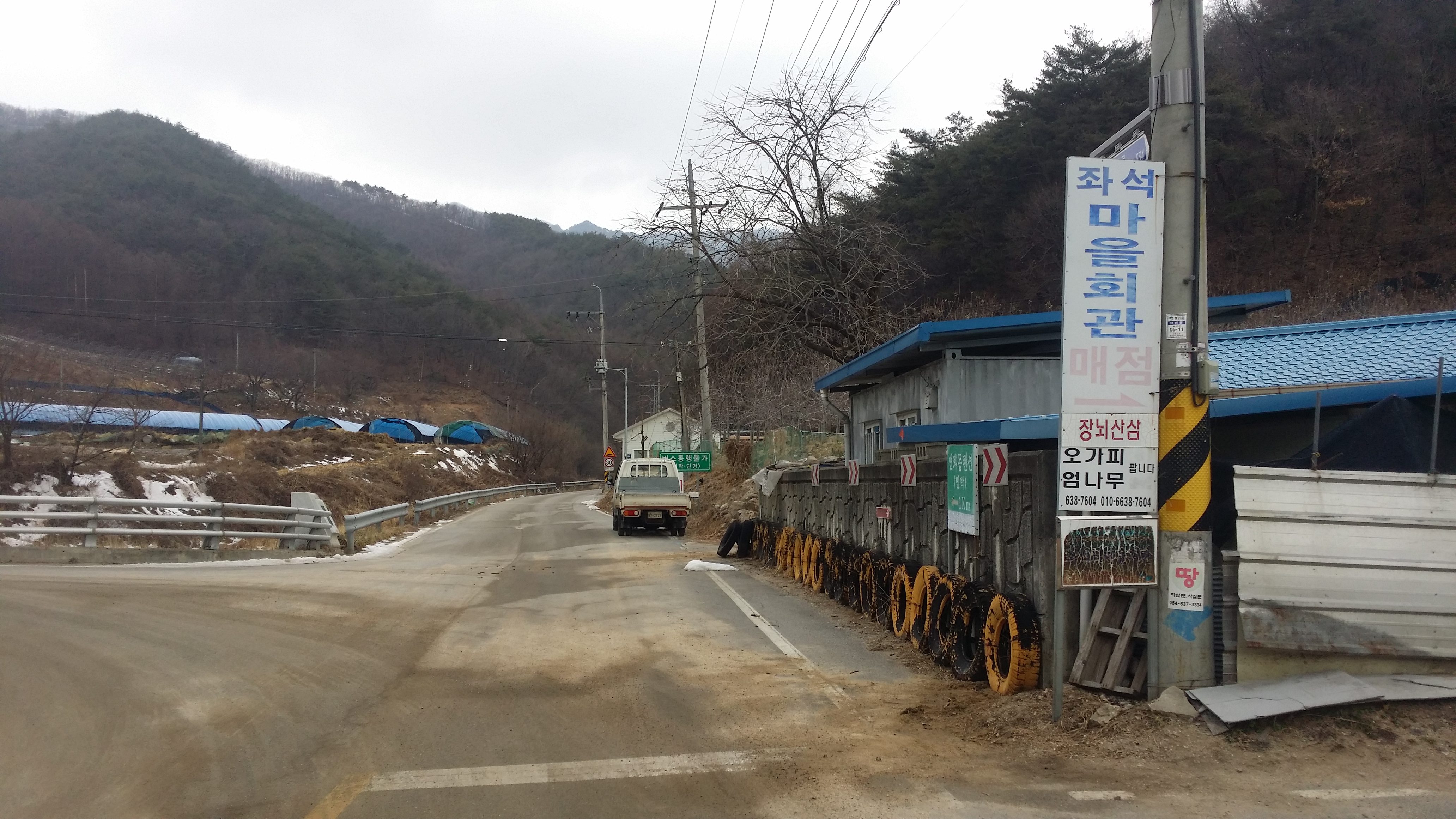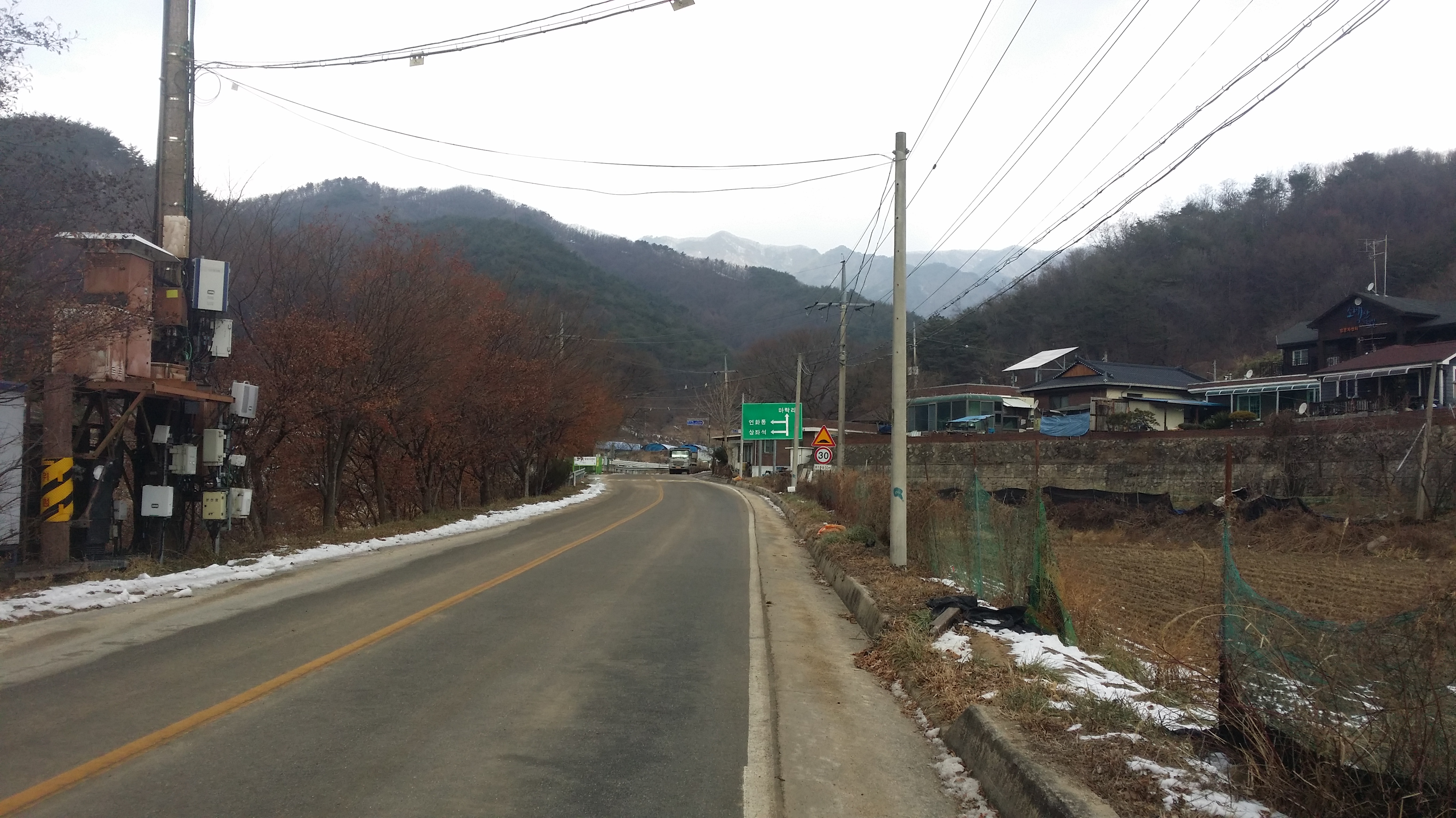 오전 10시에 잔잔하다는 뜻을 전체로 곡해해 여태껏 욕했네10:14 단산에서 내려 좌석리를 향해 걷는다.도로변 가장자리에 눈이 녹질 않은걸로봐 첫눈? 산행이 될것 같다.소백산 백두대간 마루금