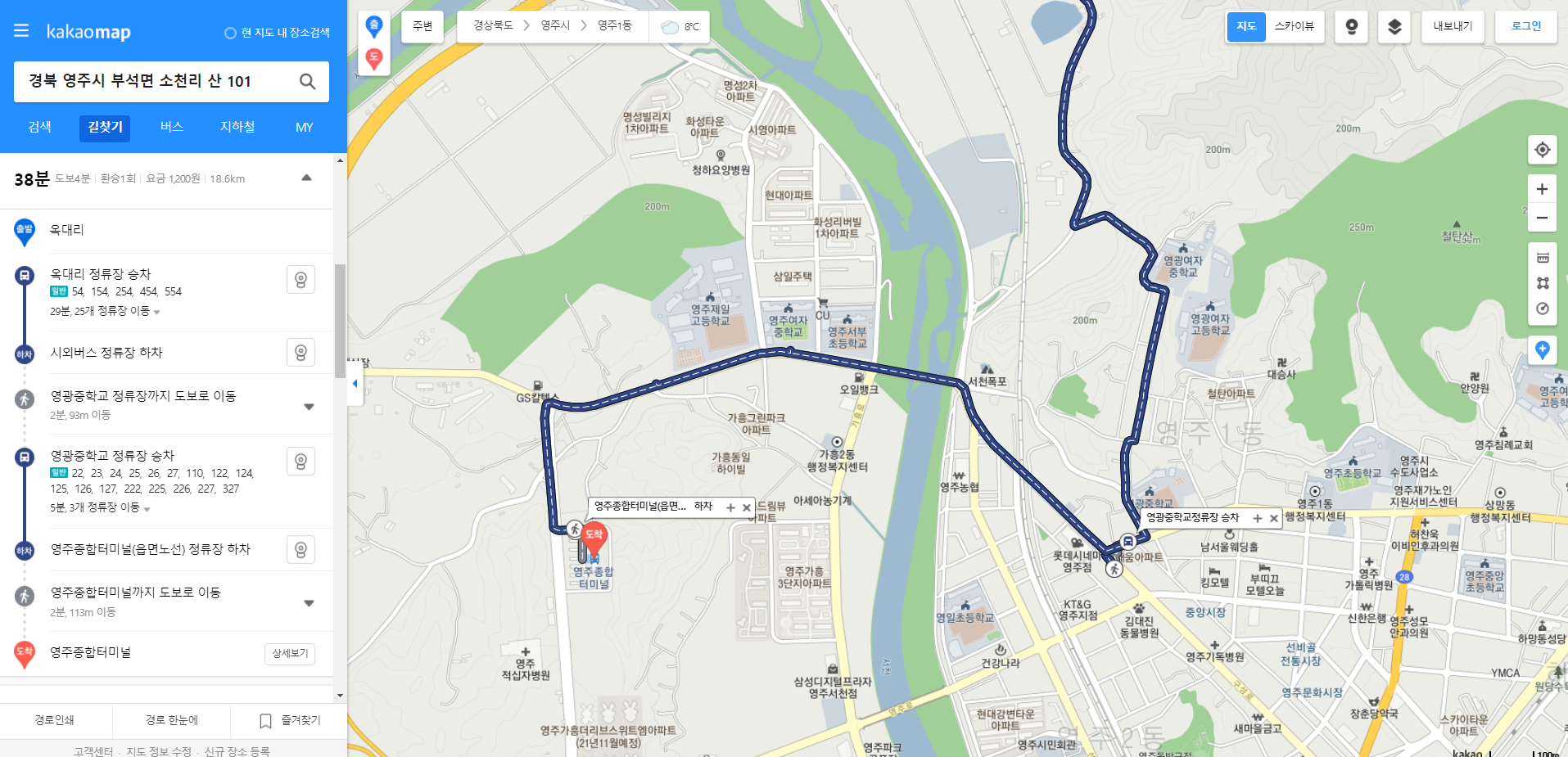 16:09 천마산(△/385.7m)16:20 332.5봉에서16:36 부엉재 / 오늘은 여기까지16:41 단산식당도 있는데, 시간이 안맞다 / 준비한 떡과 계란으로 떼운다16:46 아침에 하차한 옥대종점에 도착17:10~17:32 서청교(시외버스정류장)에서 하차하여 영광중학교로 이동17:34~17:42 영주종합터미널 도착영주시외버스 터미널
