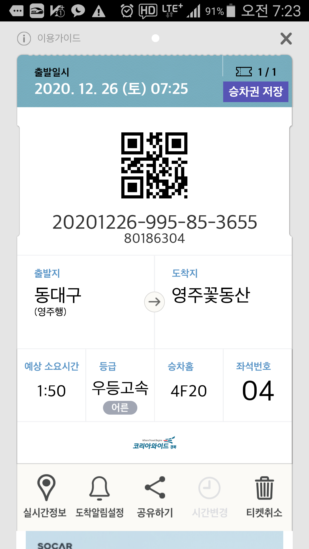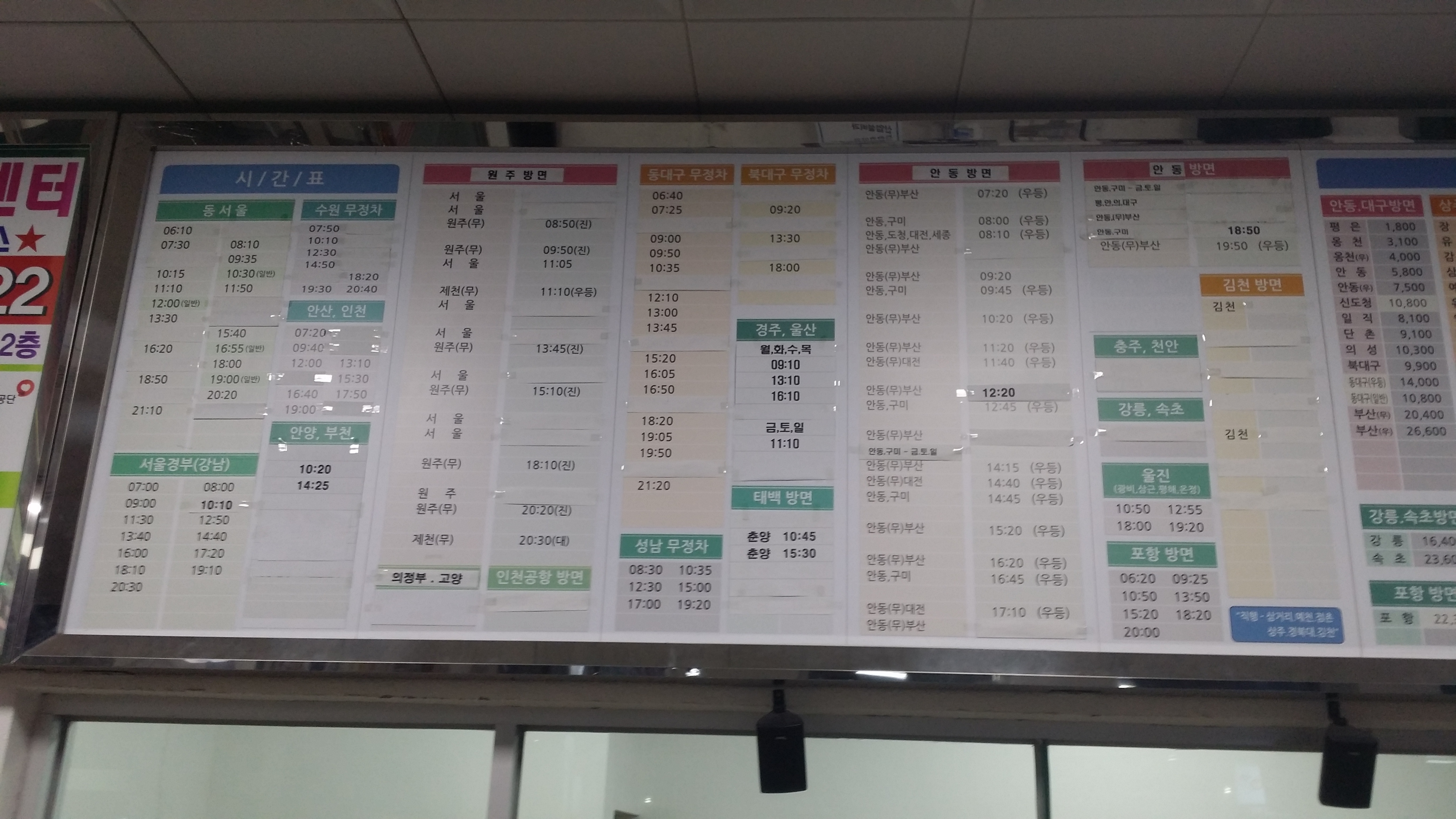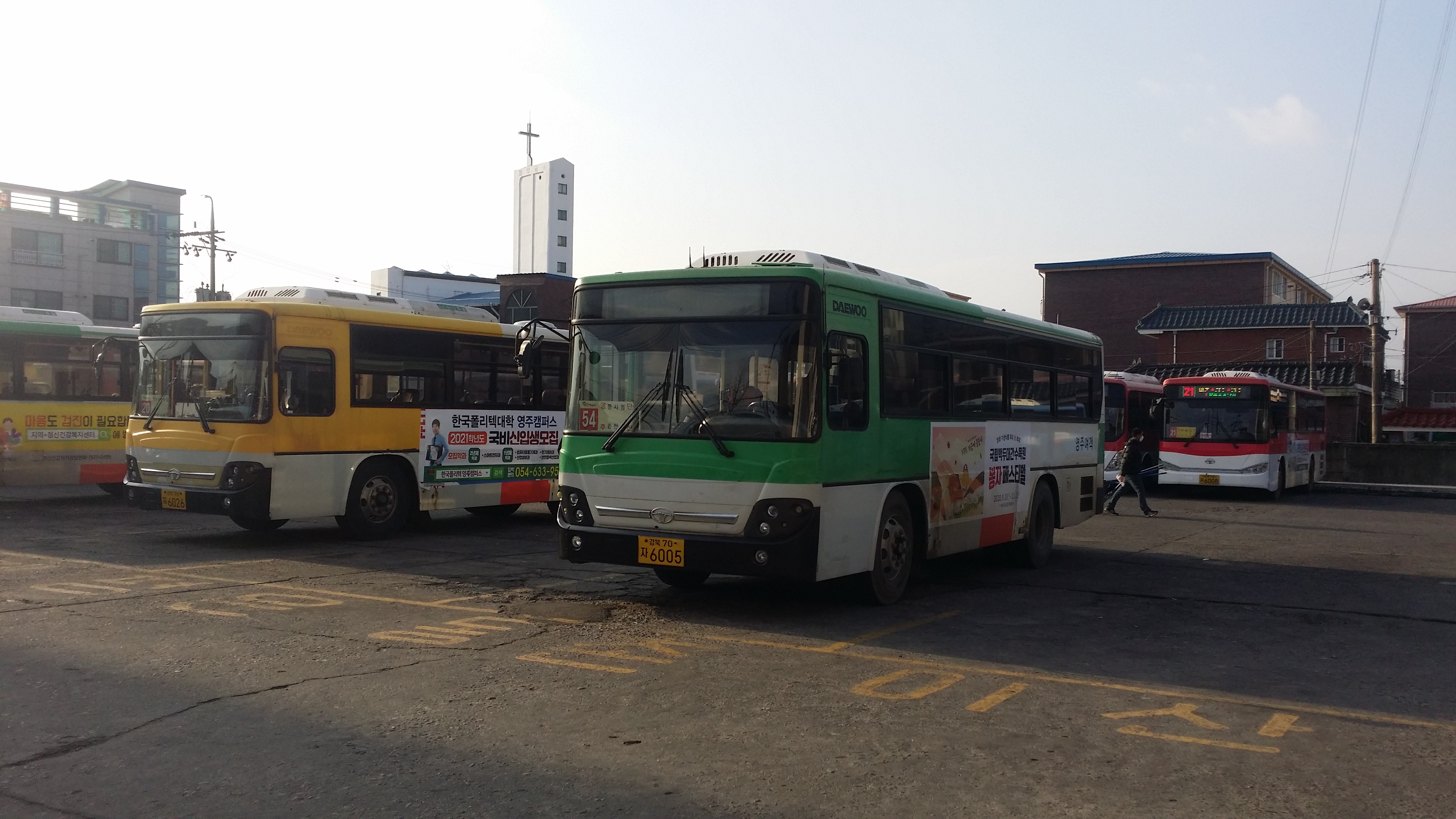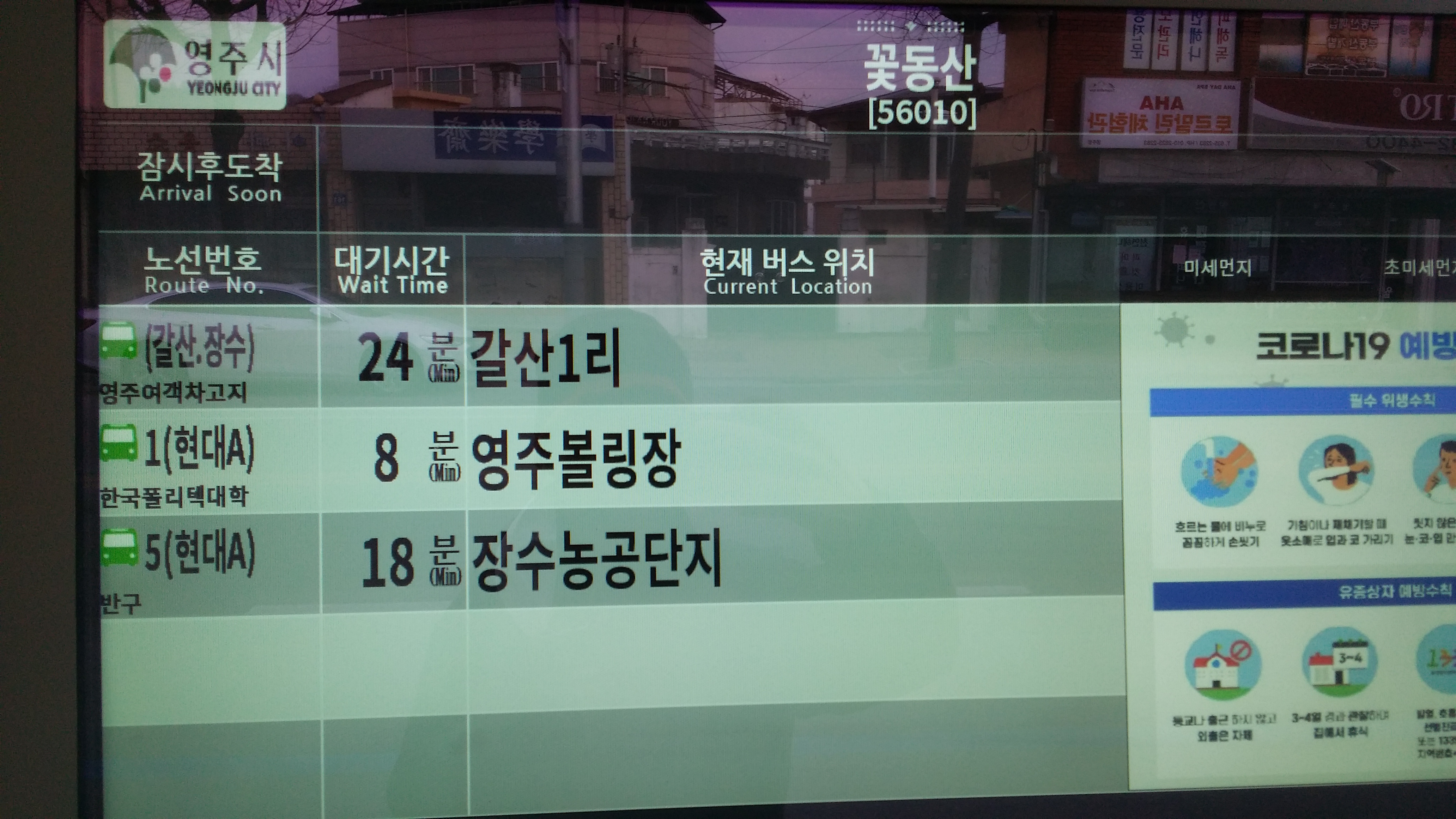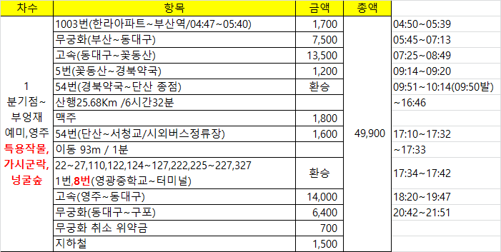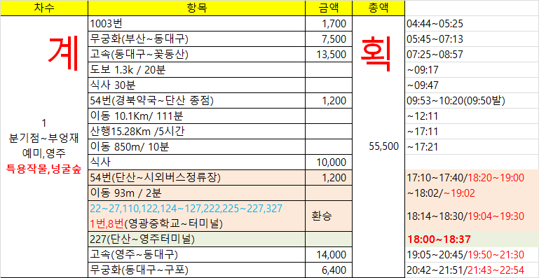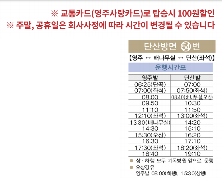 1003번(급행) 버스 시간이 언제 부턴가 변경되었다. 예전엔 첫차를 타면 부산역에 5시25분에 도착했는데, 5시39분에 도착한다. 속력을 낼수도 있는데 고의로 신호에 걸리면서까지 거북이 운행을 하여 분통이 터졌는데, 부산역에 하차하며 정류소 첫차 시간표를 보니 5시40분에 도착하는게 맞다. 고맙게도? 1분 빨리 도착했다. 예매한 기차를 타기 위해 달린다다들 정부 지침을 준수하고 있는데, 나혼자 역행하는것 같아 미안네. 혼자다꽃동산에 하차하여 시내버스를 타기위해 120m 이동한다 5번을타고 경북약국에 하차하여 54번을 환승하는 방법이 있고영주여객 차고지행 버스를 타고 54번 환승하는 방법이 있다. 1번의 경우 영진호텔에서 하차하여 도보로 이동해야 한다.참고로 정류소에 있는 버스 배차 시간은 공휴일엔 안맞다 경북약국앞 버스 정류소가 약간 허접하다. 54번 환승되는지 확신이 안서 동네분에게 물어보니 상가시장앞(봉화행 환승정류장)으로 가란다. 찜찜한 마음 여전하여 영주여객까지 다시 걸었다. 결론은 동네분이 엉터리로 가르켜 줬다. 사전에 파악한 경북약국 정류소가 54번 환승정류소다 영주여객내 버스시간표 / 100% 버스 시간이 게재되지 않은것 같다