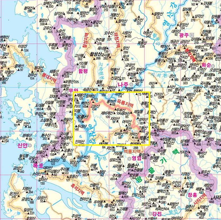 땅끝기맥 활성산(498m) 북쪽 1.3km지점의 약 418m봉에서 북서쪽으로 백룡지맥이 분기하여 백룡산(420.8m)에 가서 산줄기는 다시 분기하여 북쪽으로 조리봉(227.7m), ,오봉산(162.3m), 태마산(85.4m), 두류산(106m), 고문산(103.5m), 옥룡산(132.9m)을 지나 나주시 동강면 옥정리 통탄마을에서 그맥을 다하는 42km되는 산줄기를 옥룡지맥(玉龍枝脈)이라 하며 삼포천의 좌측(북측)분수령이 된다.