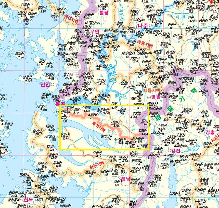 현실적으로 영암군 삼호읍 대불대학교 앞에서 영암호 수로(연암제수문)가 산줄기를 잘랐기 때문에, 사실상 섬이 된 수로 건너편 산줄기가 15km 가량 되므로 여기서 마감할 경우는 흑석지맥은 26km 정도 밖에 되지 않지만 조선지형도(1918)를 보면 영암호 수로는 없고, 삼학도를 마주보는 용당리까지 산줄기는 이어져 있다. 따라서 흑석지맥은 별뫼산에서 영산강 하구의 용당리까지가 맞다.