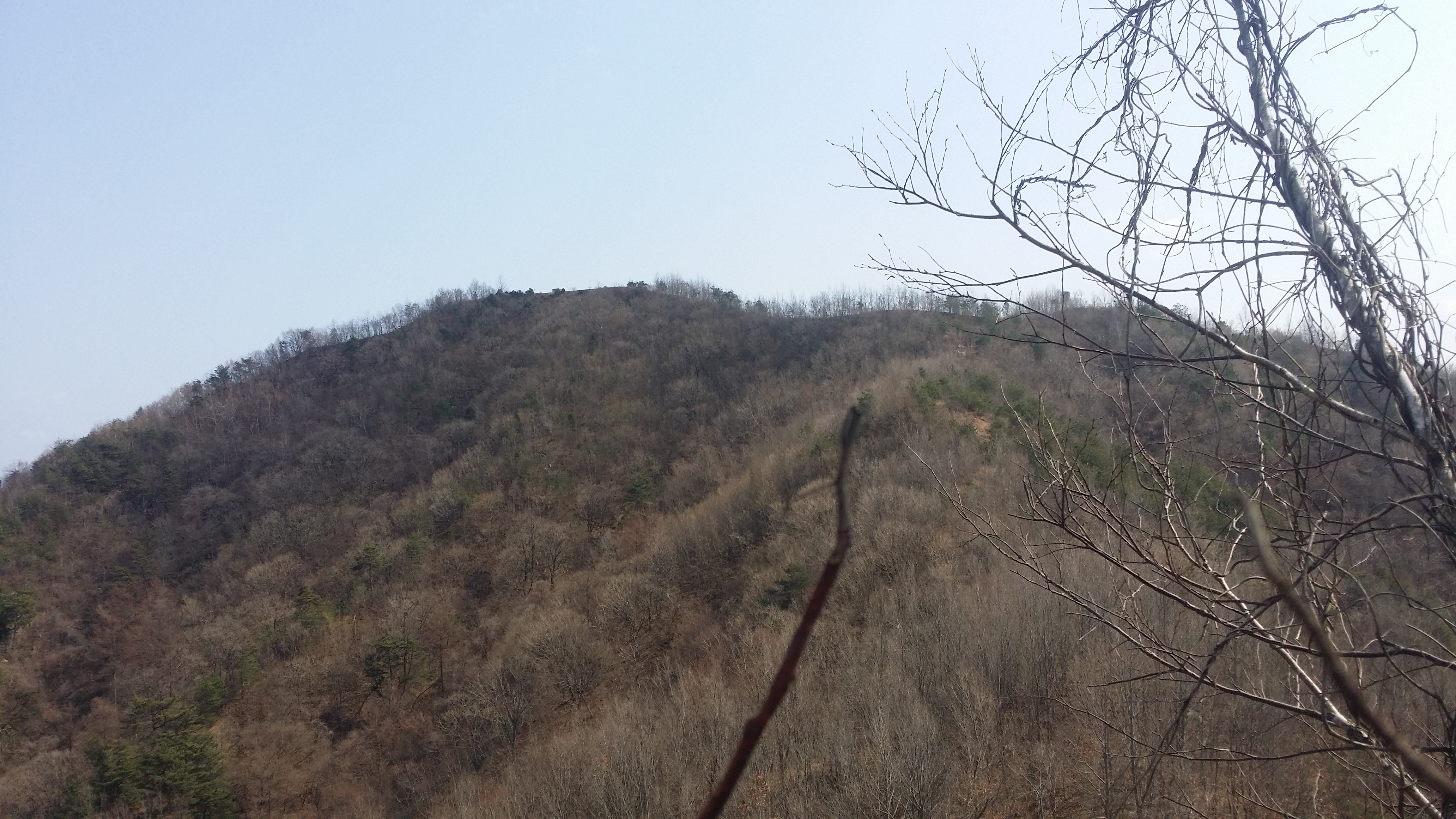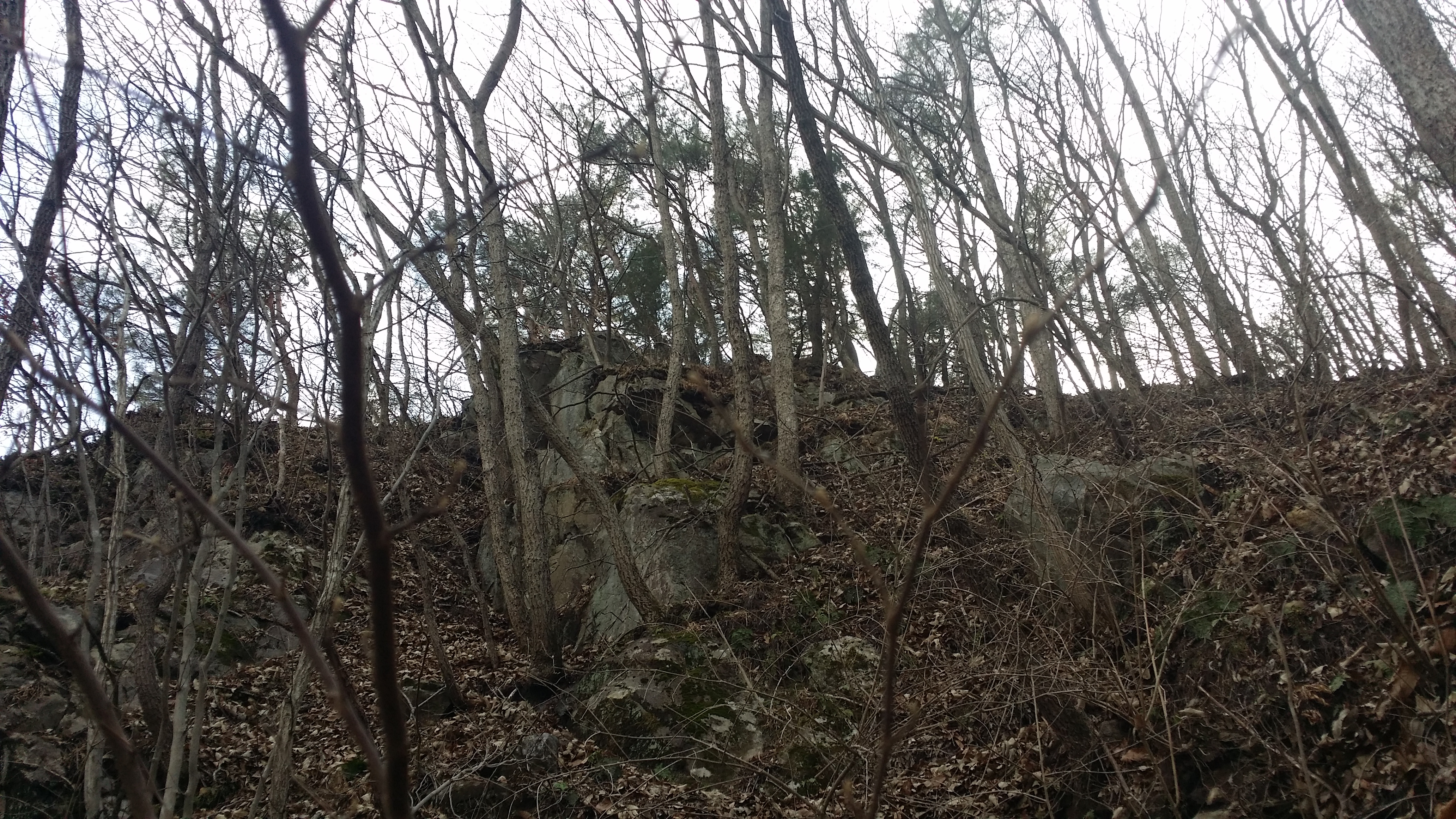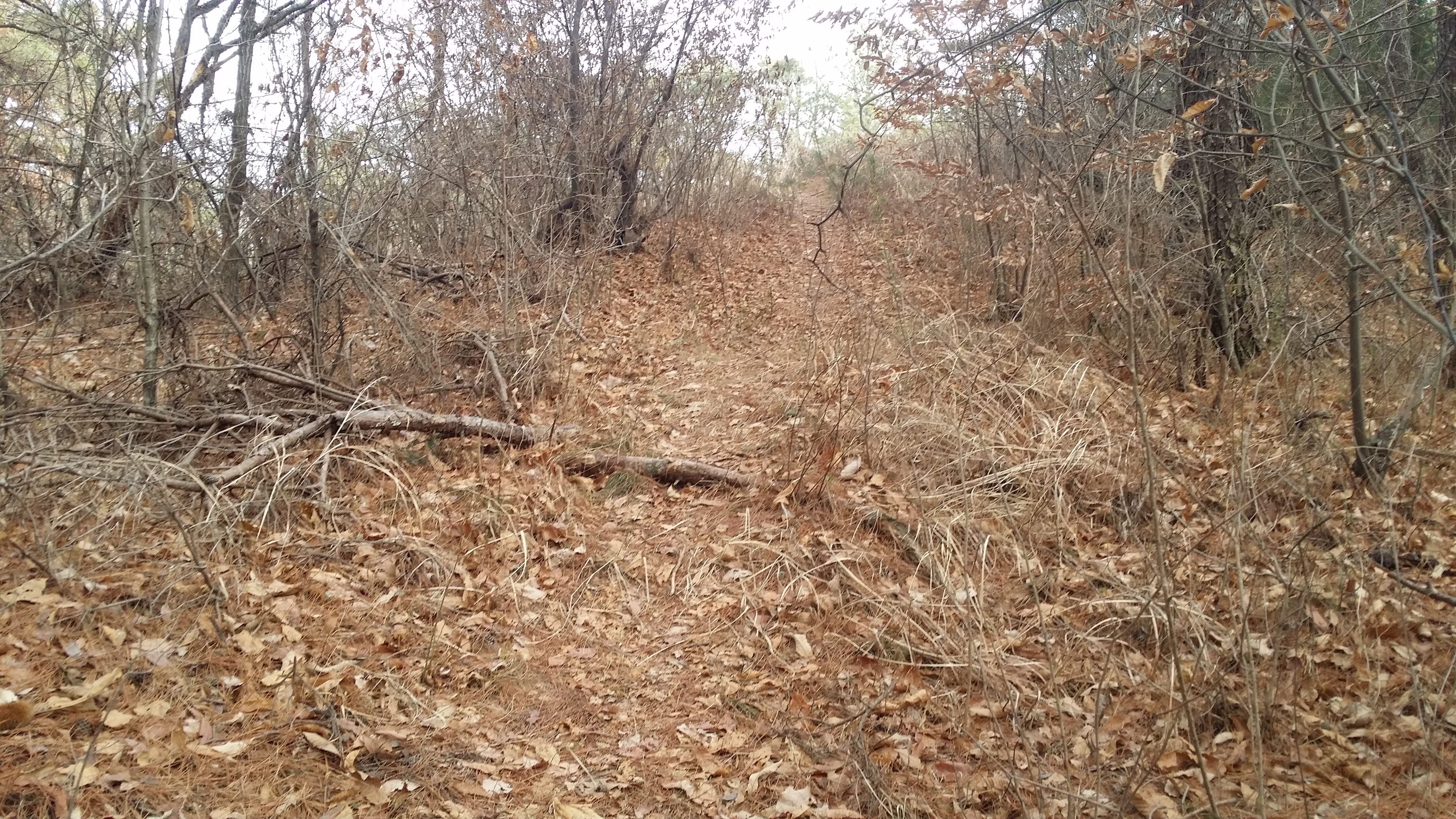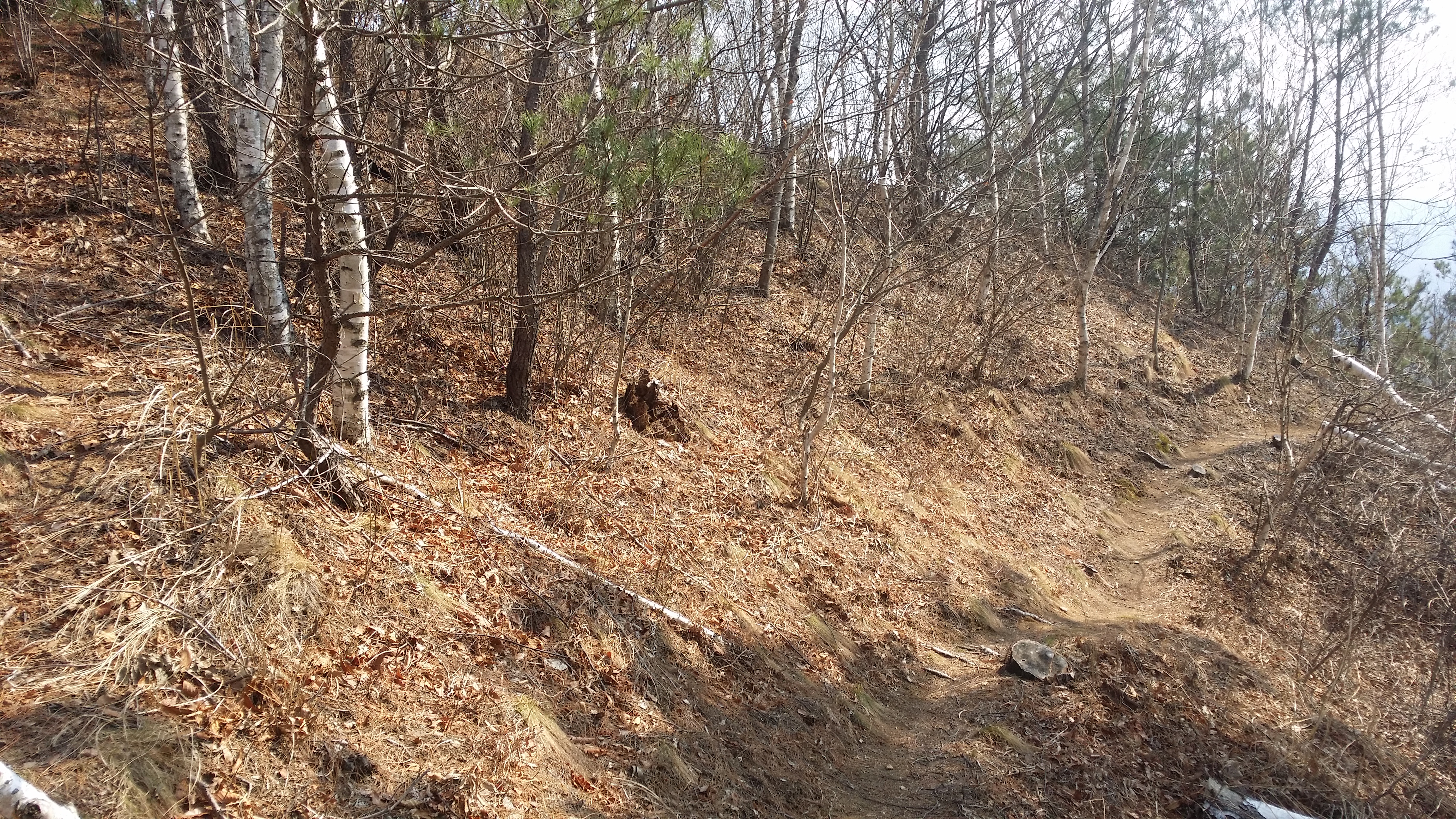 11:43 누군가 로프를 설치하여 어렵게 내려섰다.아쉽게도 반대편 능선으론 로프가 없다. 좌측으로 이동하여 능선을 바라보니 산꾼들의 족적이 안보인다 반대편 능선으로 진행하니 등로가 있다