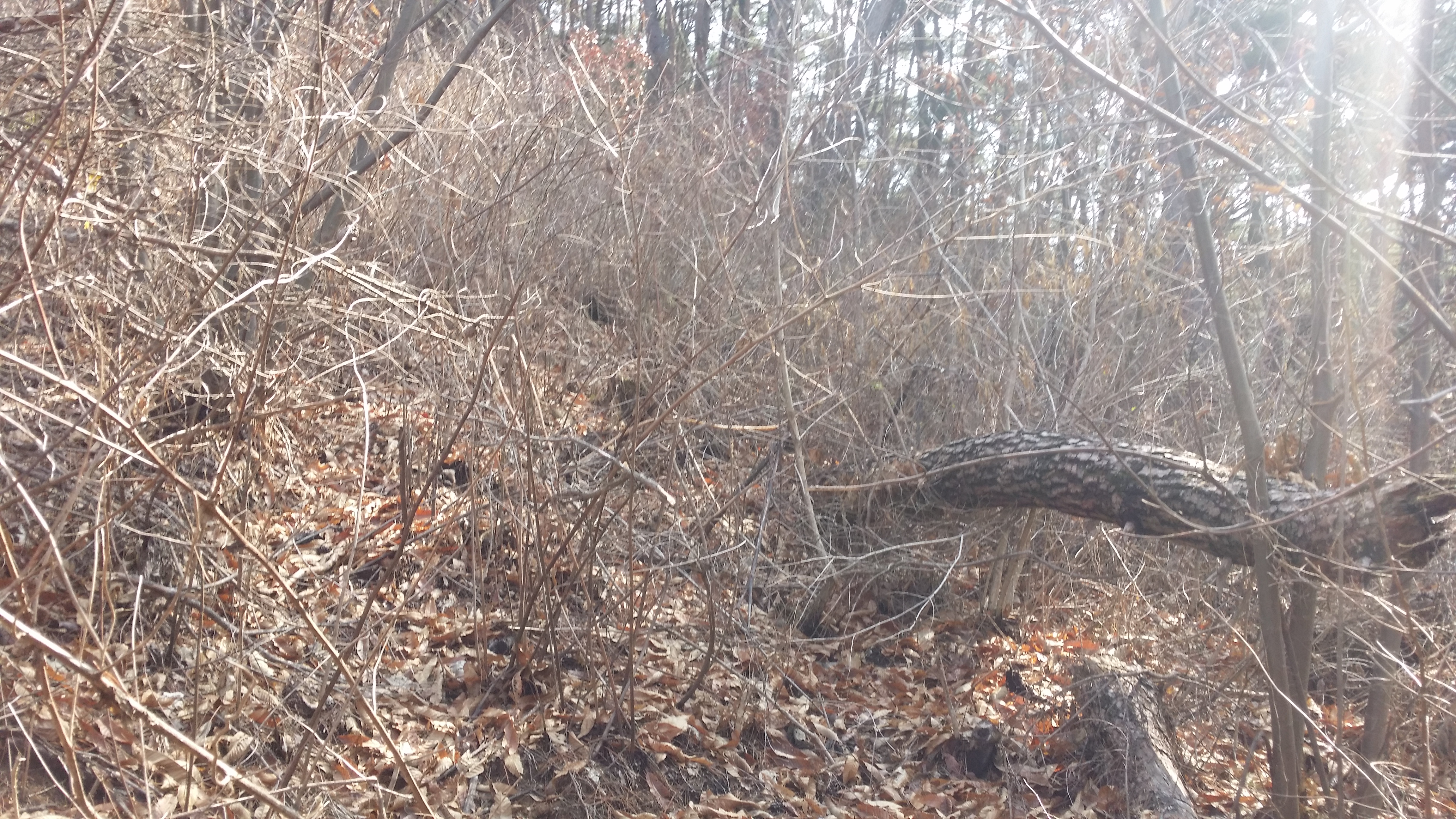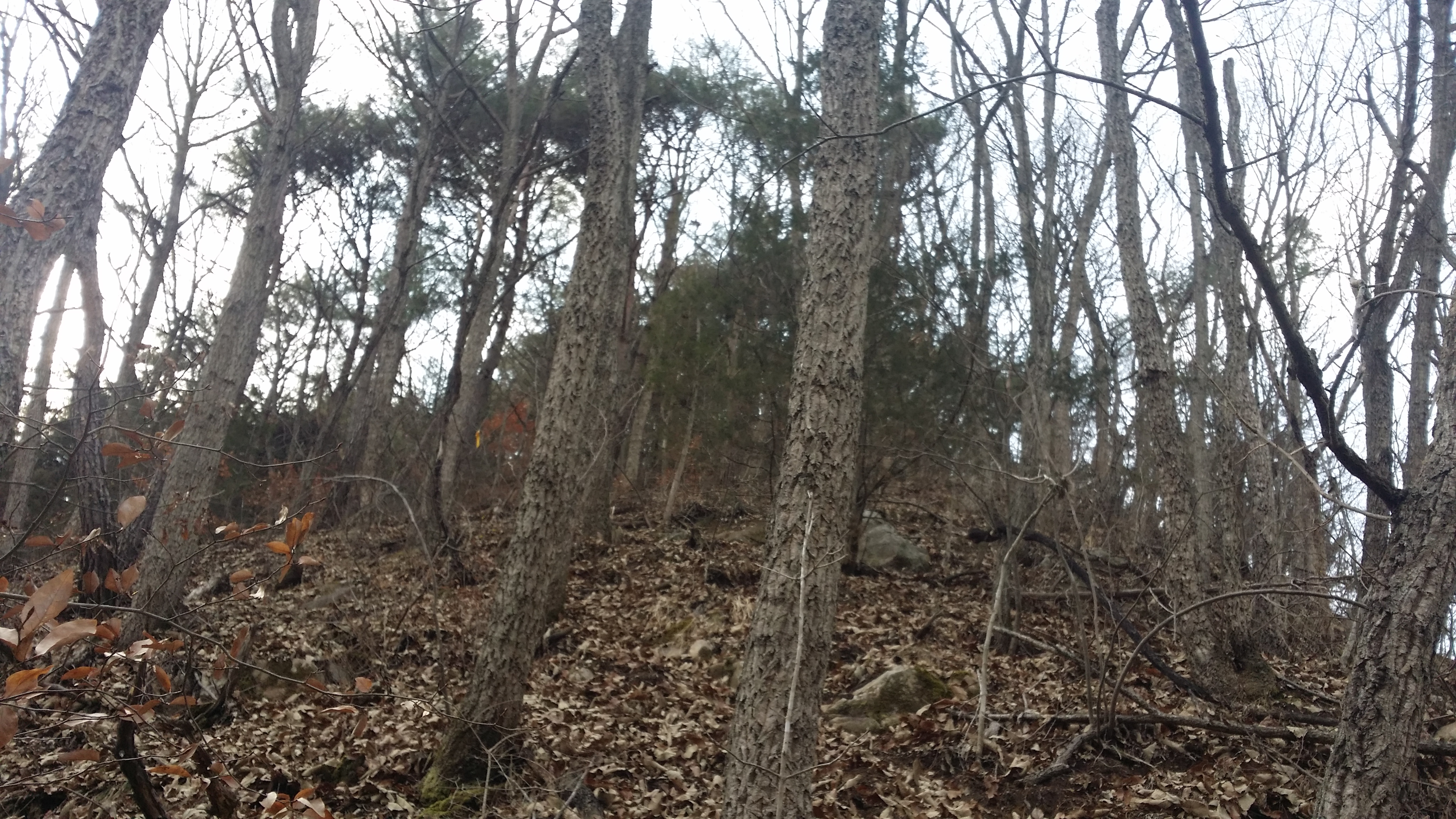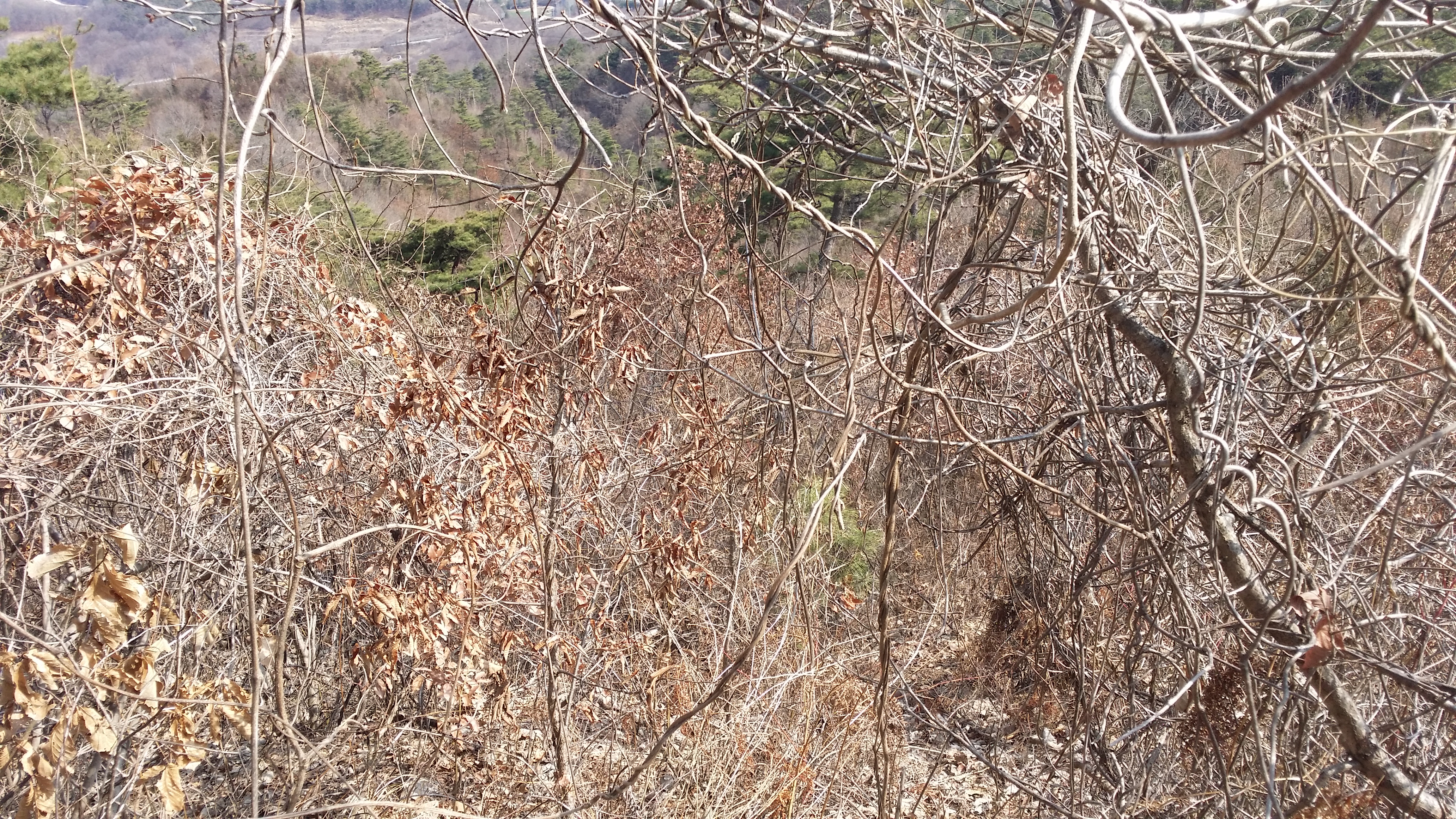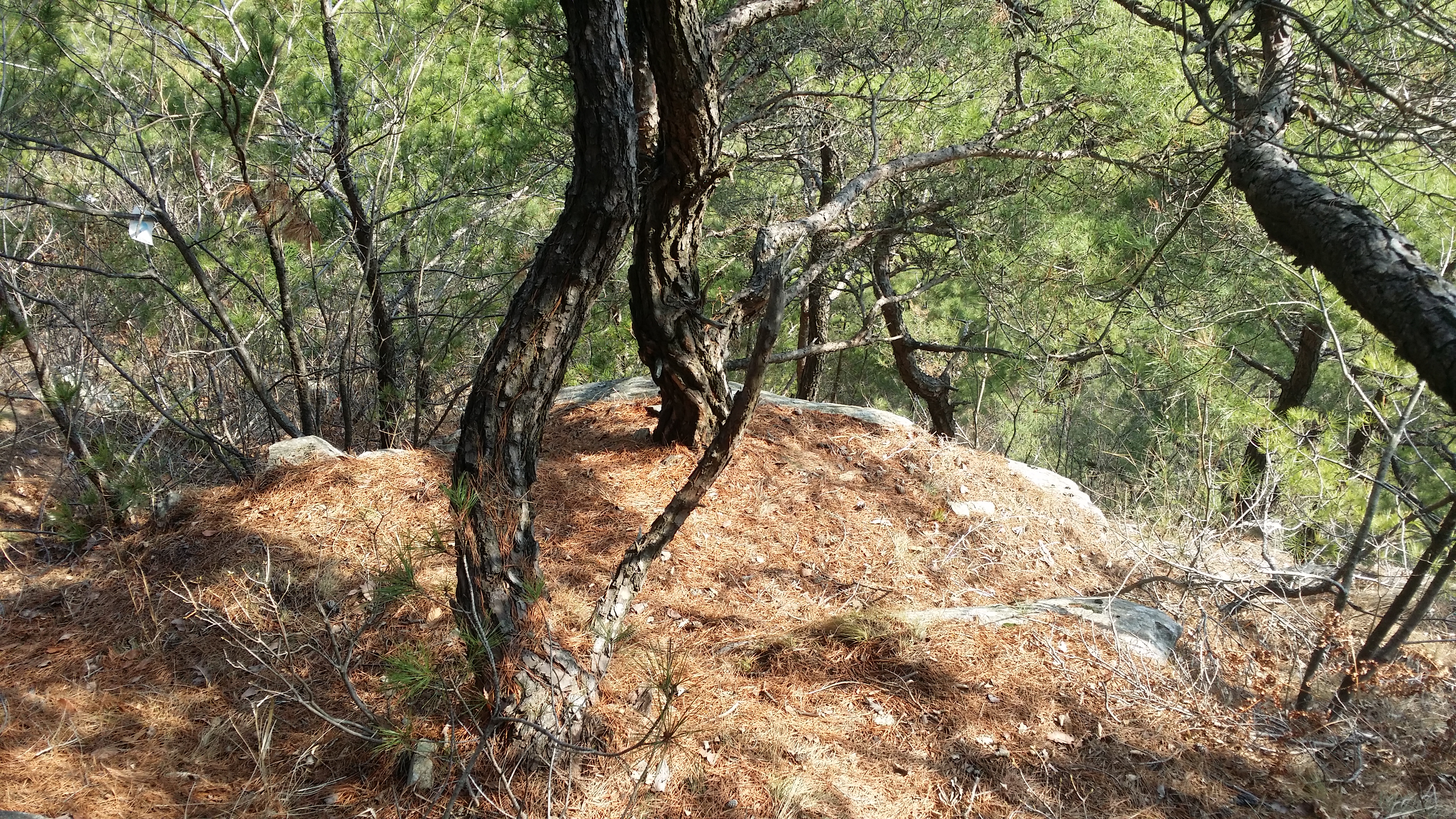 11:43 누군가 로프를 설치하여 어렵게 내려섰다.아쉽게도 반대편 능선으론 로프가 없다. 좌측으로 이동하여 능선을 바라보니 산꾼들의 족적이 안보인다 반대편 능선으로 진행하니 등로가 있다