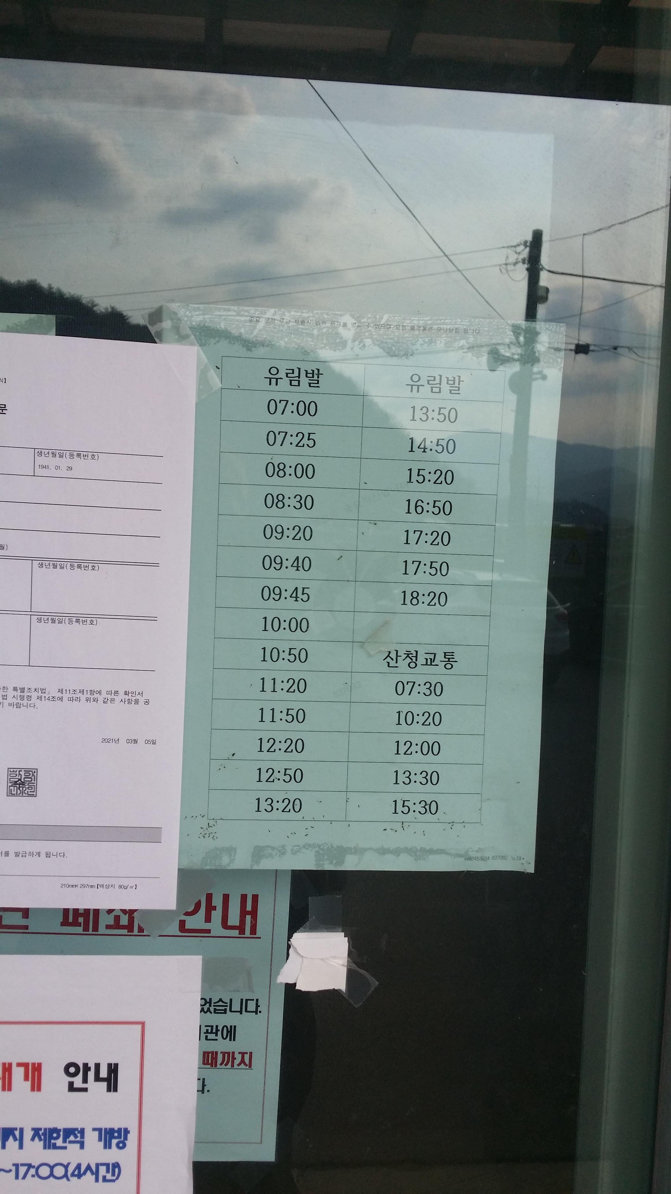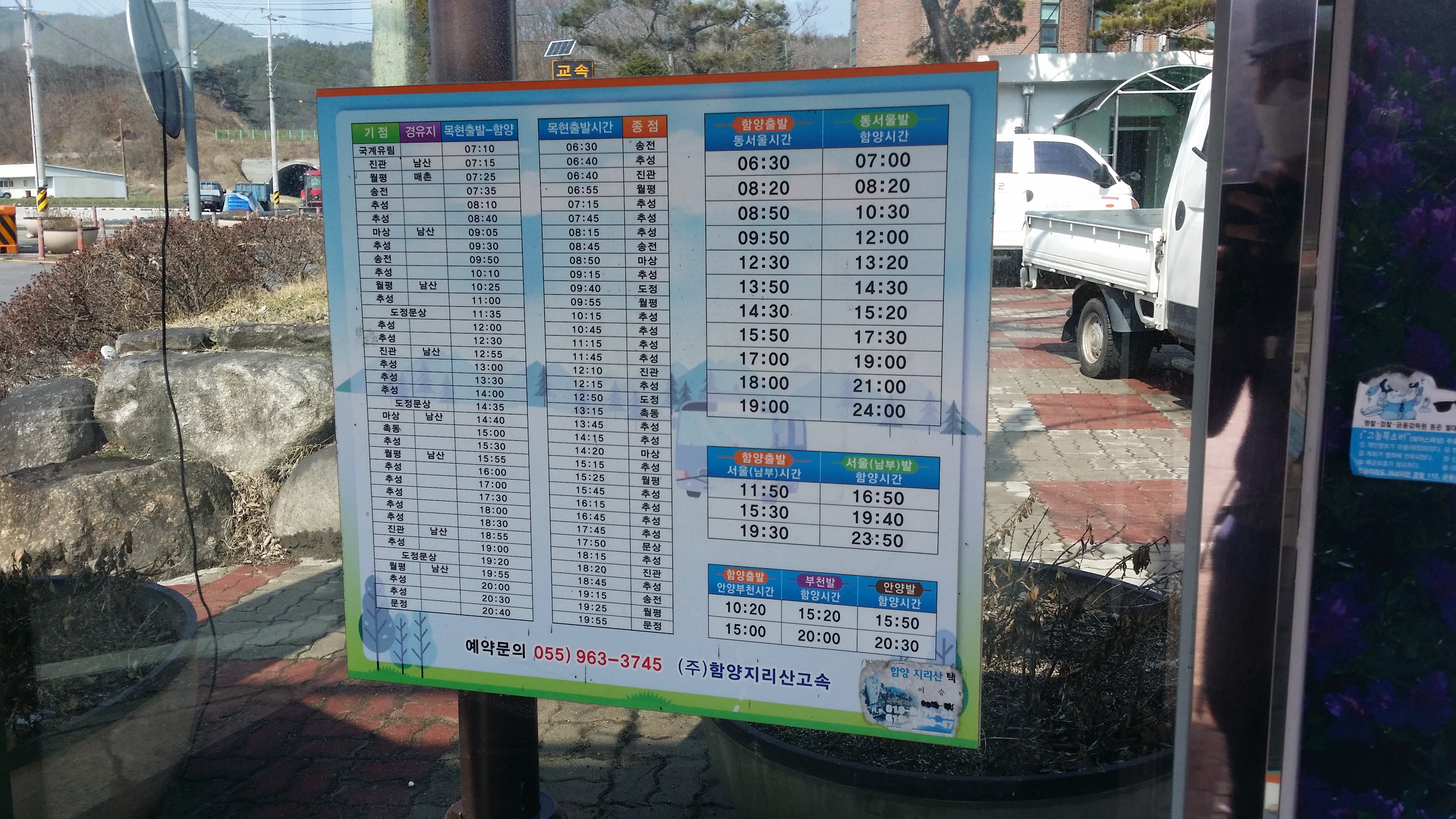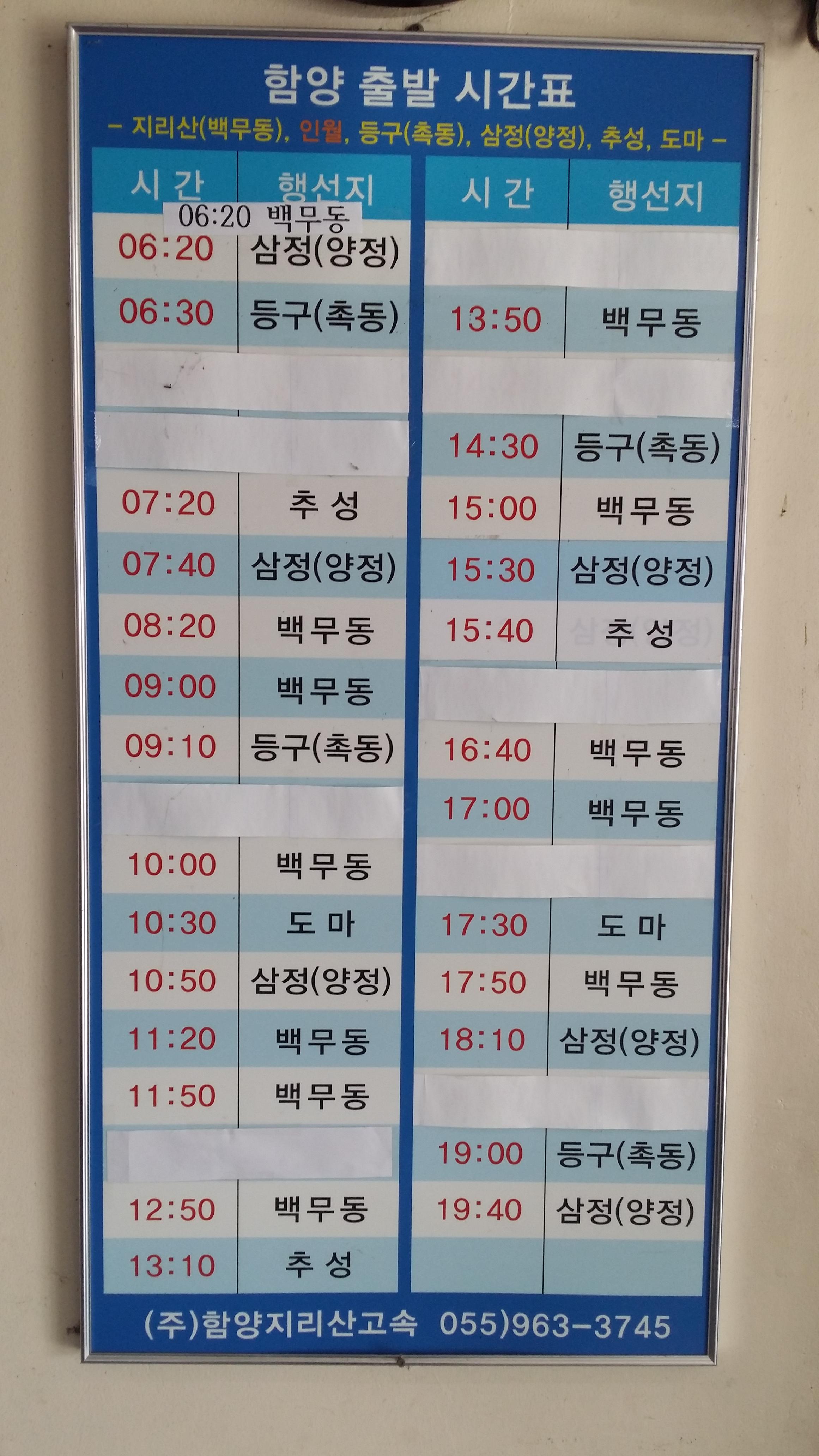 16:19 유림대략 종점에서 30분후 유림에서 출발하는것 같다.16:20 / 함양에서 16시에 출발한 추성행 버스가 16시22분경 목적지로 향한다추성에서 16시20분 출발한 버스가 16시48분경 도착하여 16시50분 함양을 향해 출발산방기간 때문에 백무동버스가 운행 중단된 상태인데 1년에 산방기간 2.5개월 운휴하고도 운영이 되는갑네