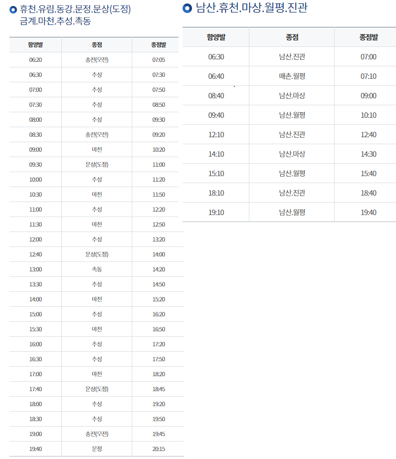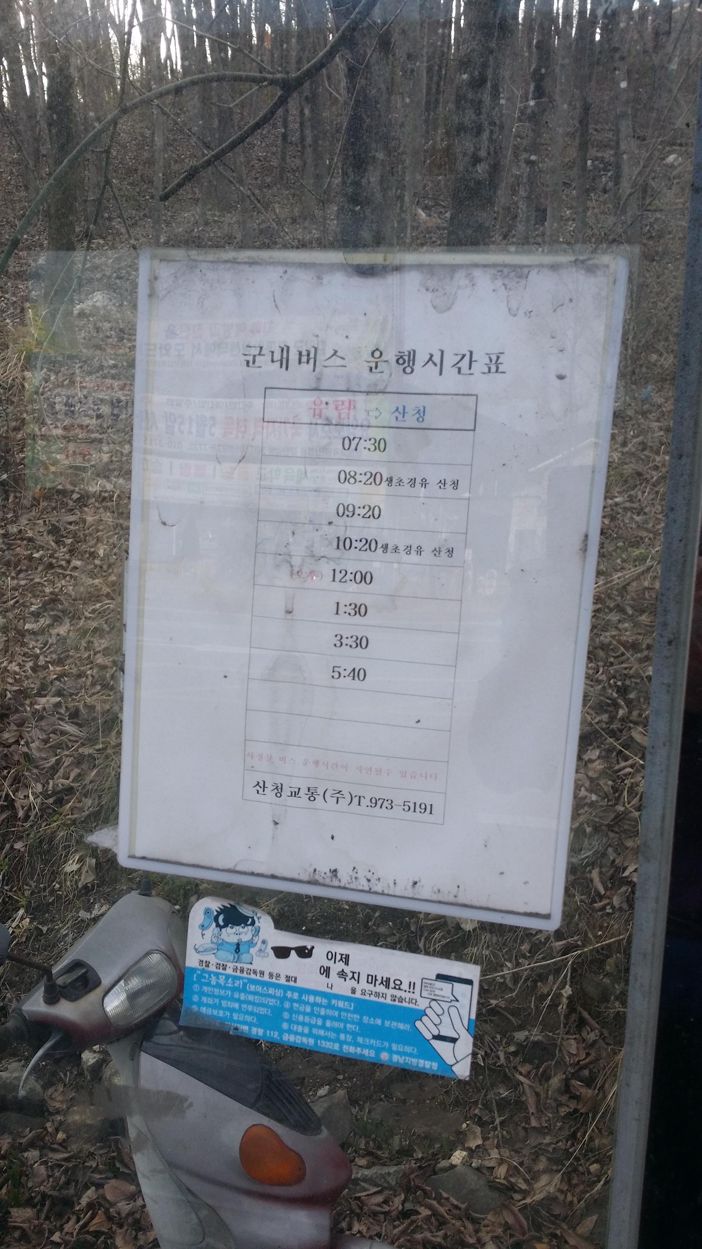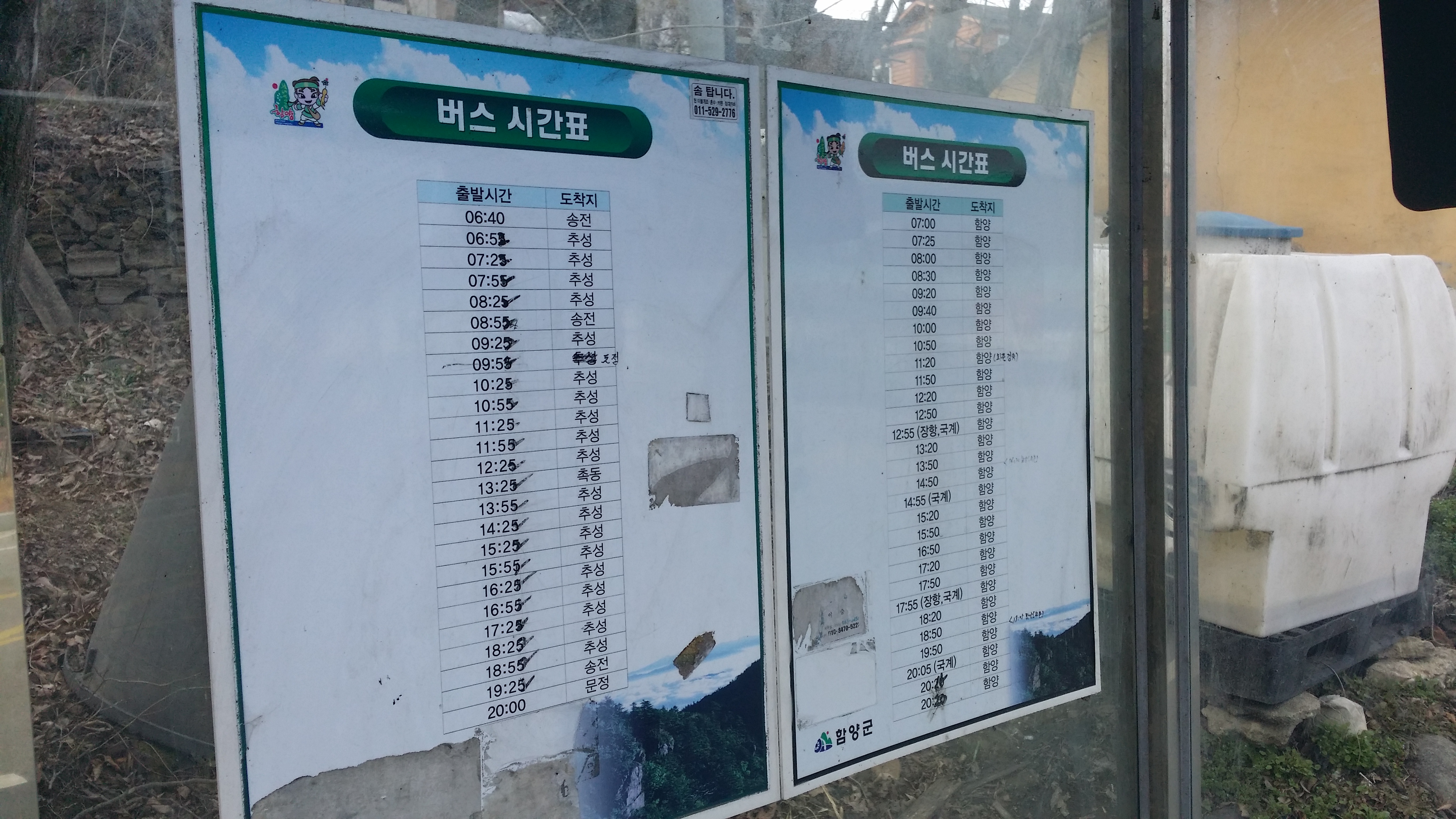 16:19 유림대략 종점에서 30분후 유림에서 출발하는것 같다.16:20 / 함양에서 16시에 출발한 추성행 버스가 16시22분경 목적지로 향한다추성에서 16시20분 출발한 버스가 16시48분경 도착하여 16시50분 함양을 향해 출발산방기간 때문에 백무동버스가 운행 중단된 상태인데 1년에 산방기간 2.5개월 운휴하고도 운영이 되는갑네