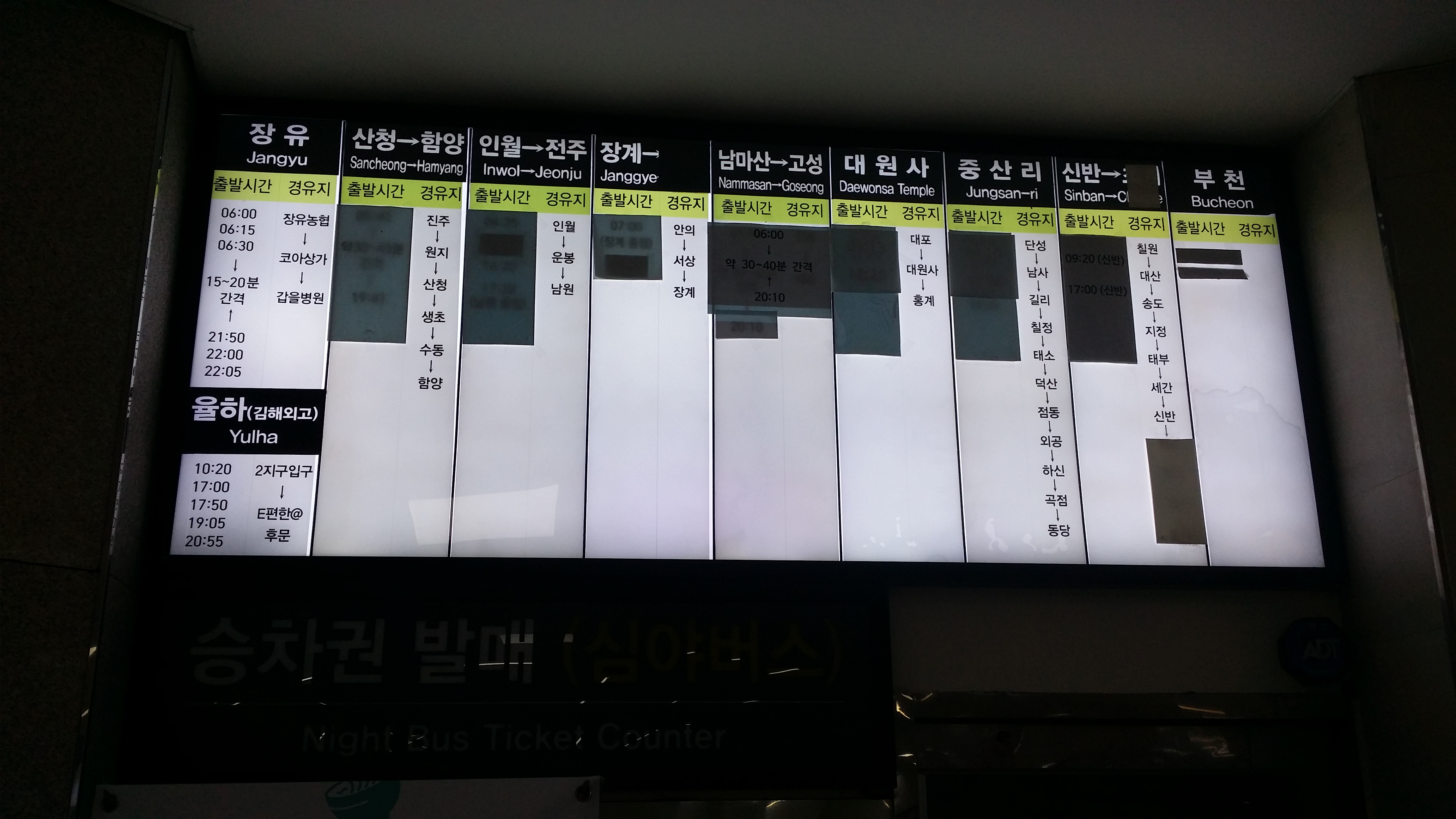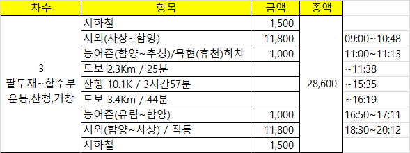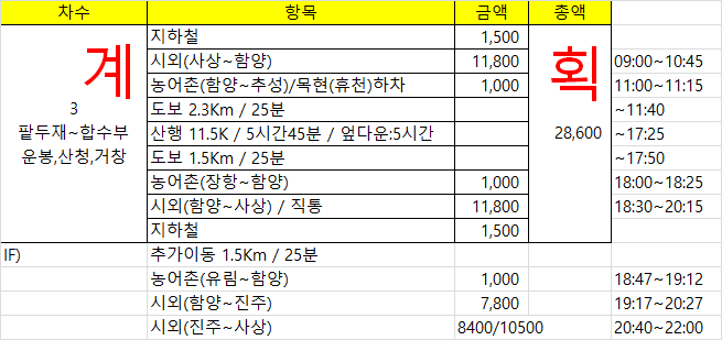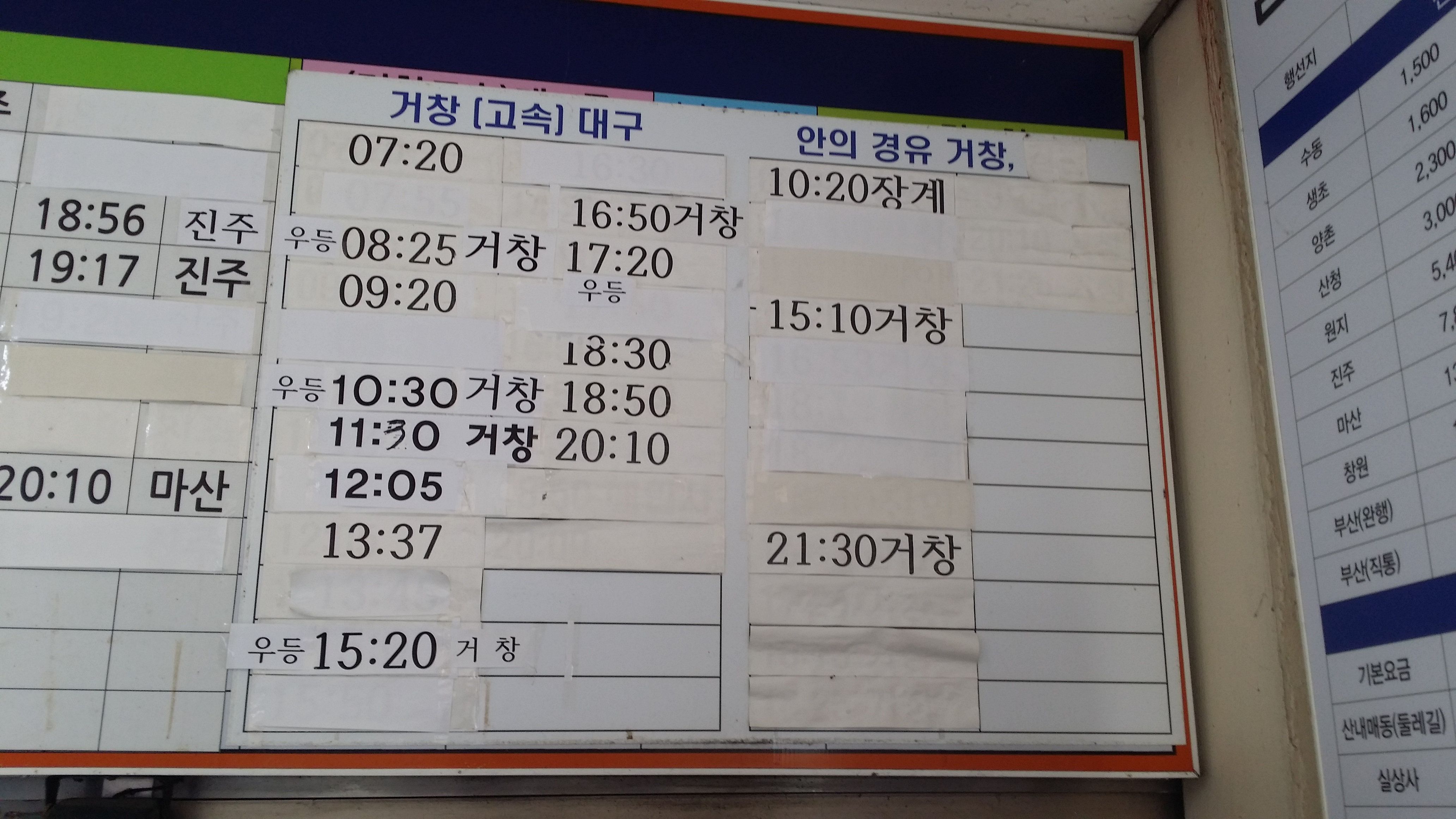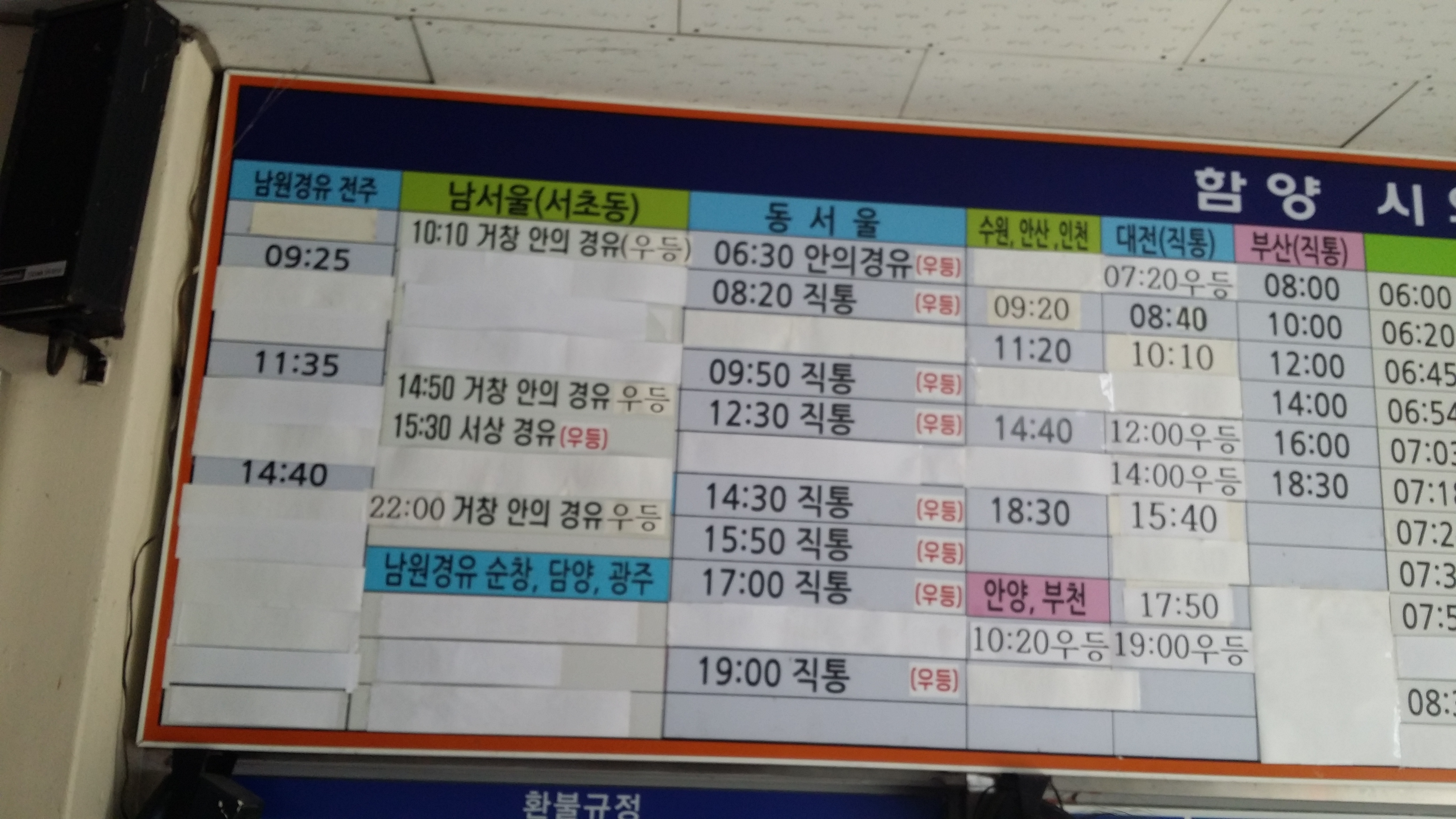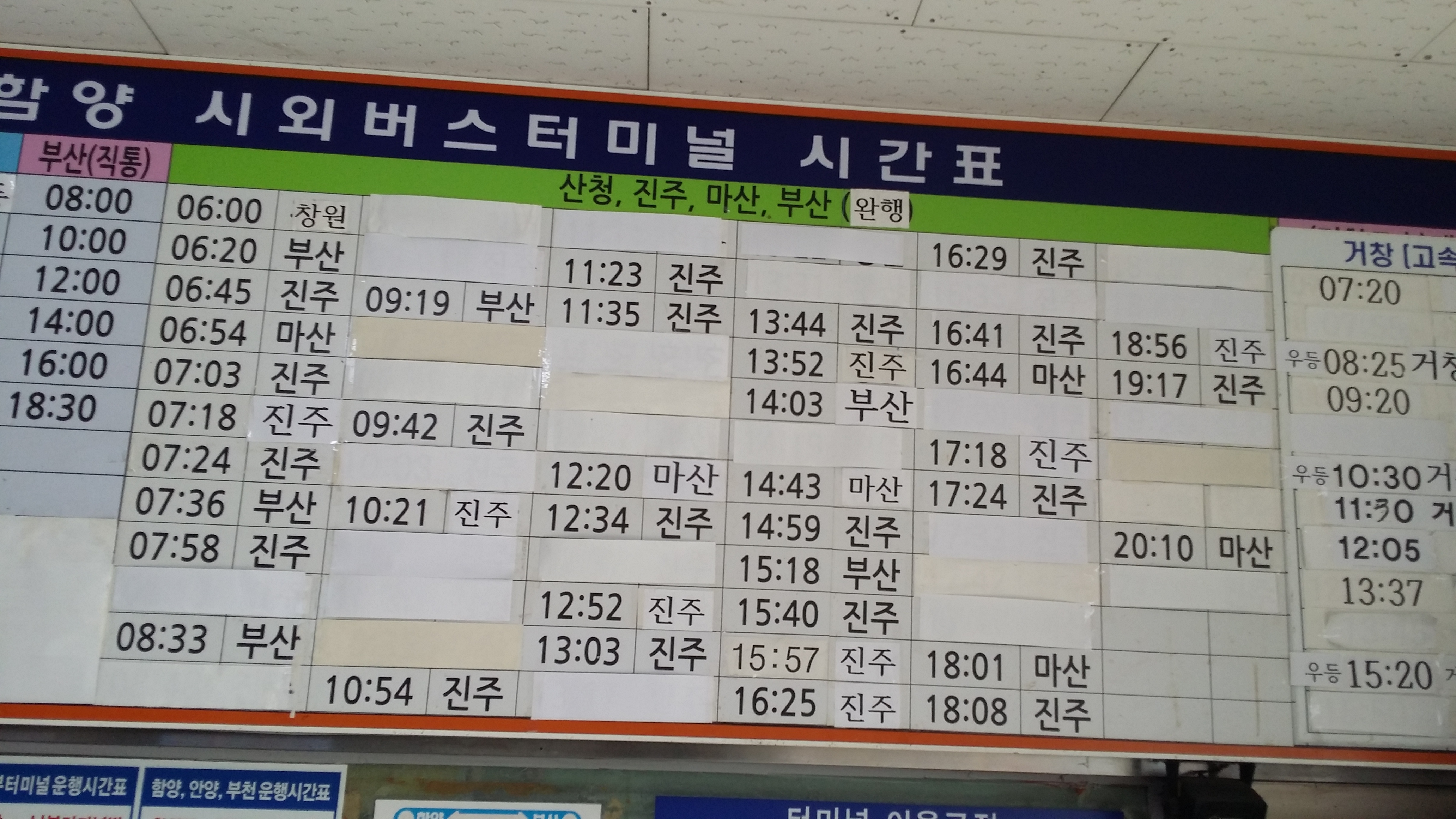 부산 서부 시외버스터미널 시간표함양 시외버스터미널함양 지리산고속 버스 시간표팥두재까지 도보로 약 45분(4.4Km) 예상된다. 팥두재로 운행하는 버스는(시간표 우측/마상, 월평, 진관행) 지리산고속(주)로 이동하여야 하며 시간이 안맞아 추성, 마천행 버스를 타고 휴천면소재지(목현)에서 하차하여 2.3Km 걸어 팥두재로 이동하기로 한다. 도착시간은 비슷하다