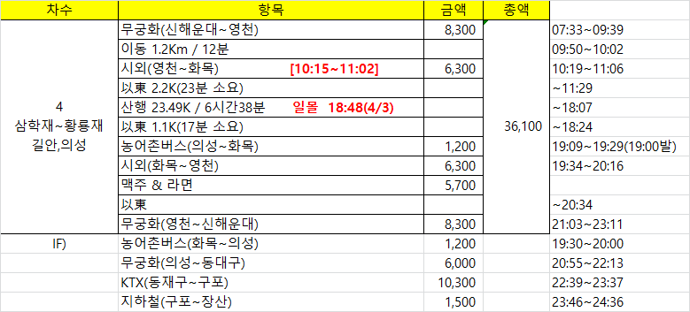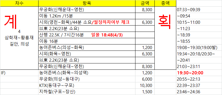 - 참고사항 : 17~20, 불루티, 물[1.45L 준비 / 1.35L 소모], 행동식[김밥2줄, 양갱50g, 육포30g, 사과1개, 계란1개, 바나나 1개, 사탕1개 / 김밥1.5줄, 사과 1개, 바나나 1개 소모]