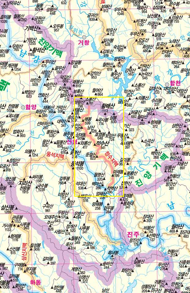 남쪽으로 분기하여 서로는 경호강, 동으로는 양천을 가르며 매봉(599m), 구인산(584.1m), 정수산(829.1m), 마제봉(198.7m), 적벽산(166.3m)을 지나 양천이 경호강에 합류하는 산청군 신안면 하정리(원지)에서 맥을 다하는 도상거리 34.7km 되는 산줄기로 양천의 좌측 분수령이 된다.